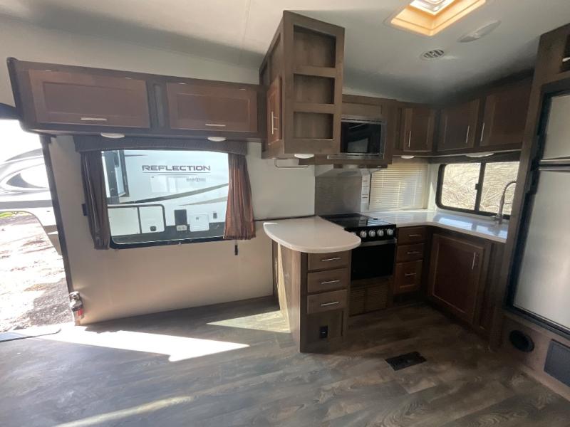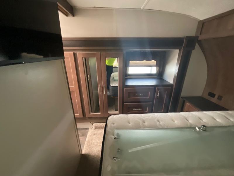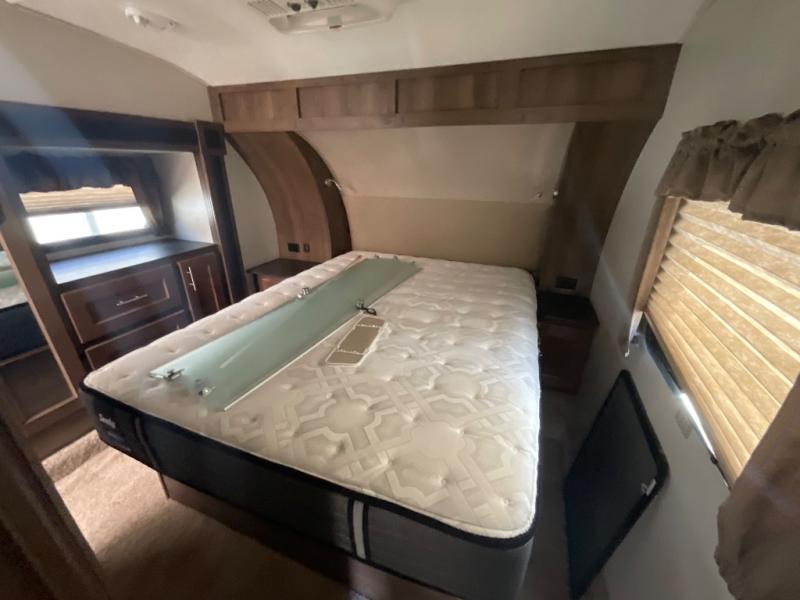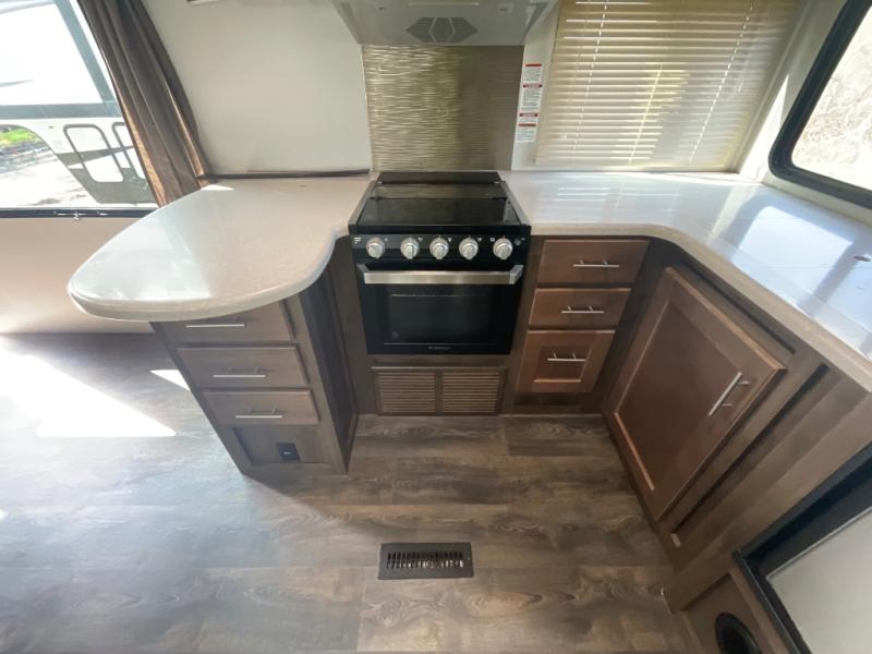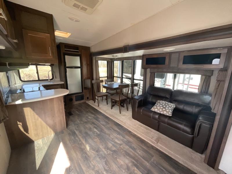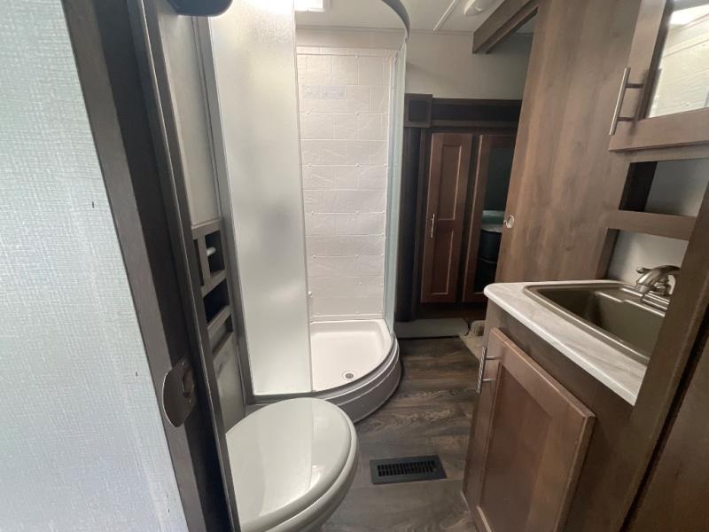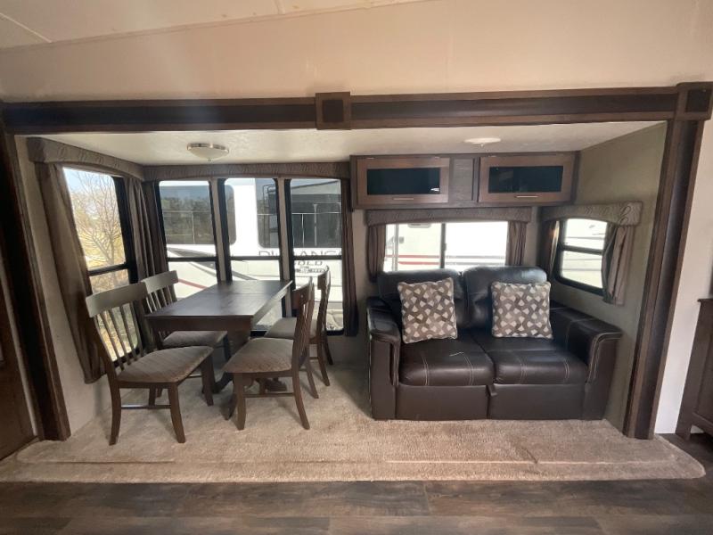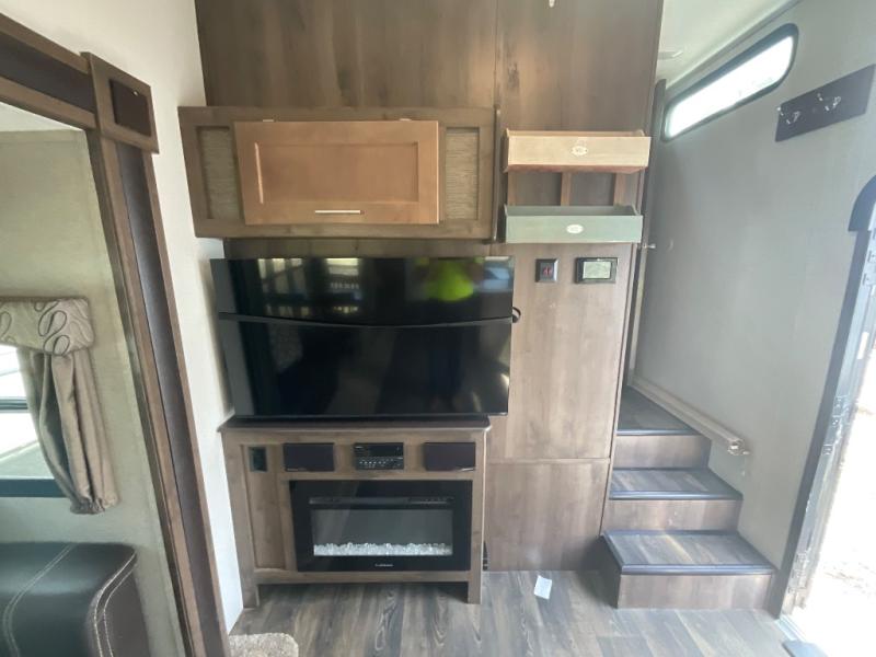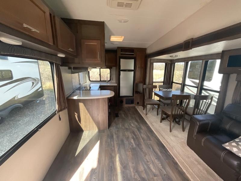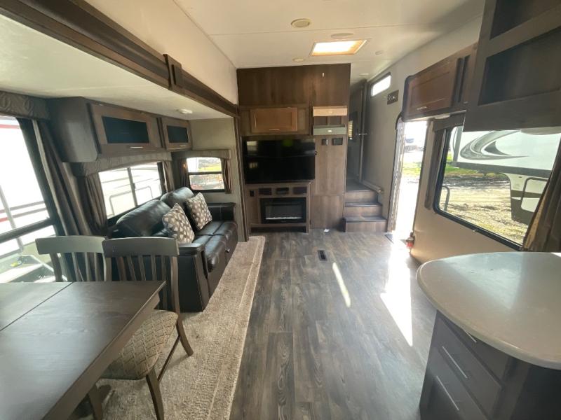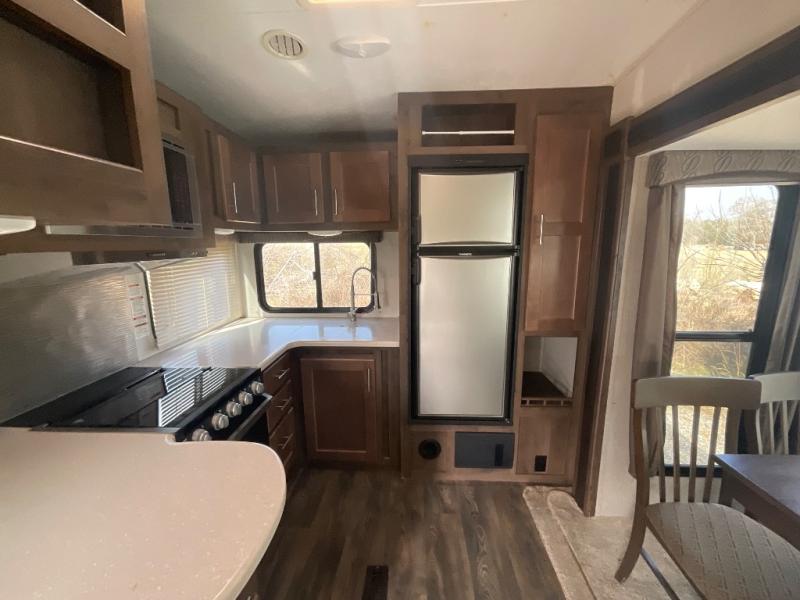 Imagine the perfect size fifth wheel for your family or just the two of you. With sleeping space on the queen bed in the spacious front bedroom, plus the U-shaped dinette and sofa slide out, the kids can invite their friends for a fun weekend. The rear kitchen will have you making meals for everyone with all the counter space and appliances at your fingertips. Clean up in the double entry bath, then relax on the lounge chairs or head outside and sit under the 13' awning. The bedroom even includes a desktop and drawers within the slide out if you decided to work remotely. Get started on your your next adventure!