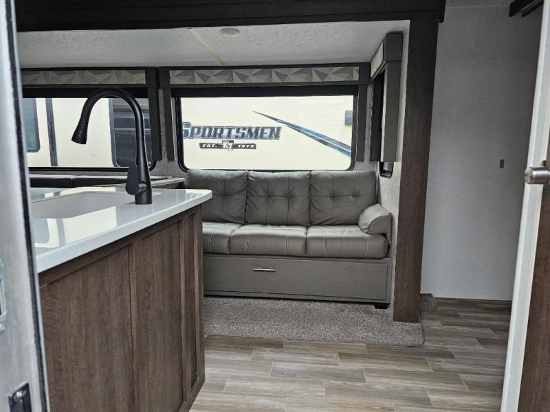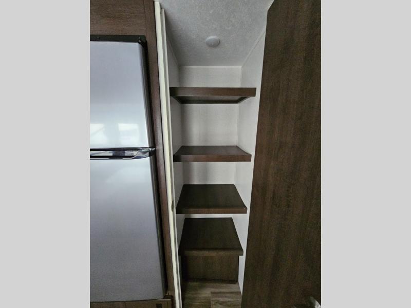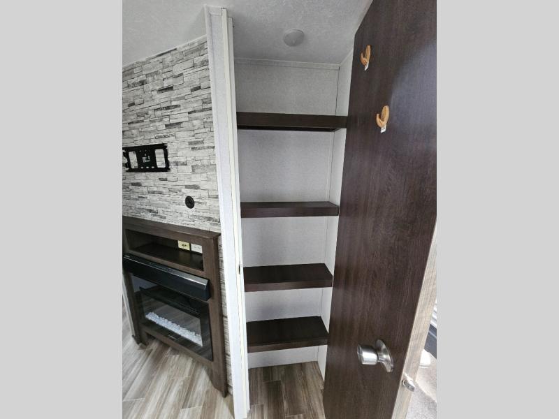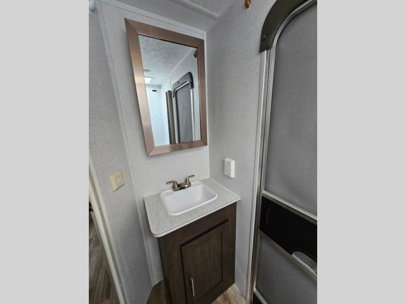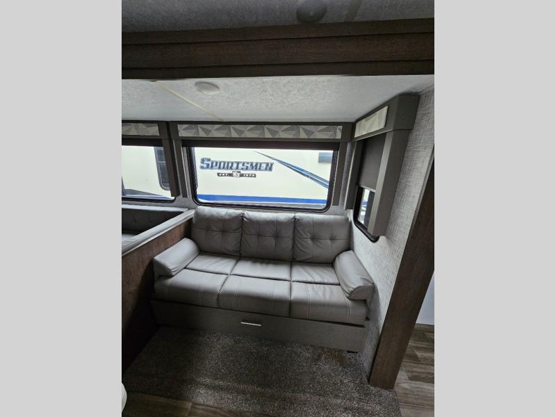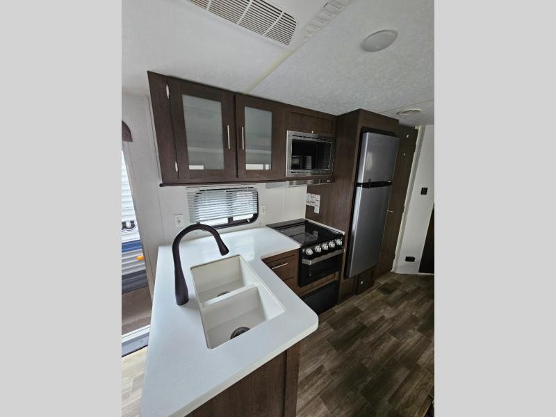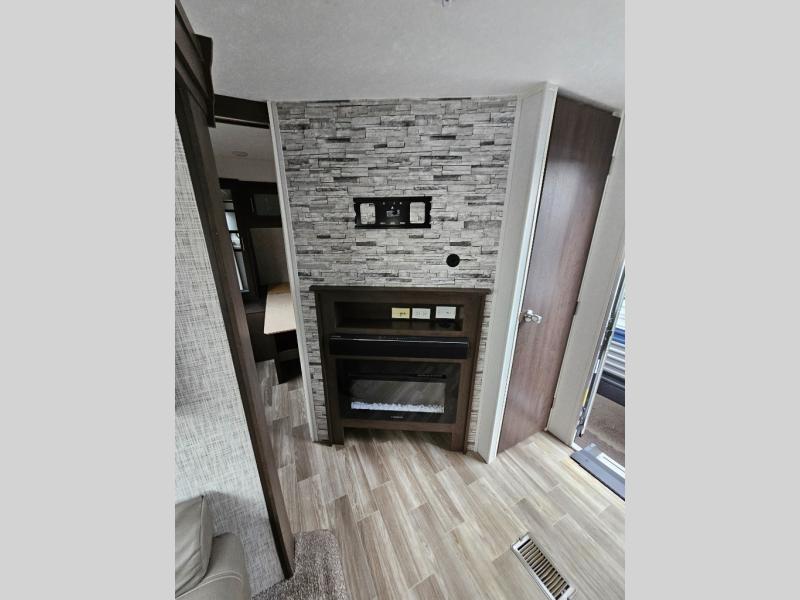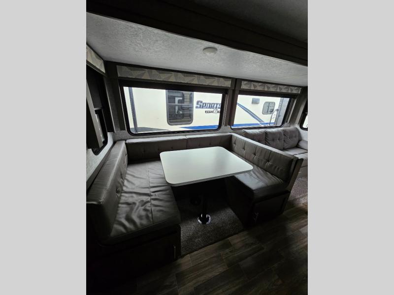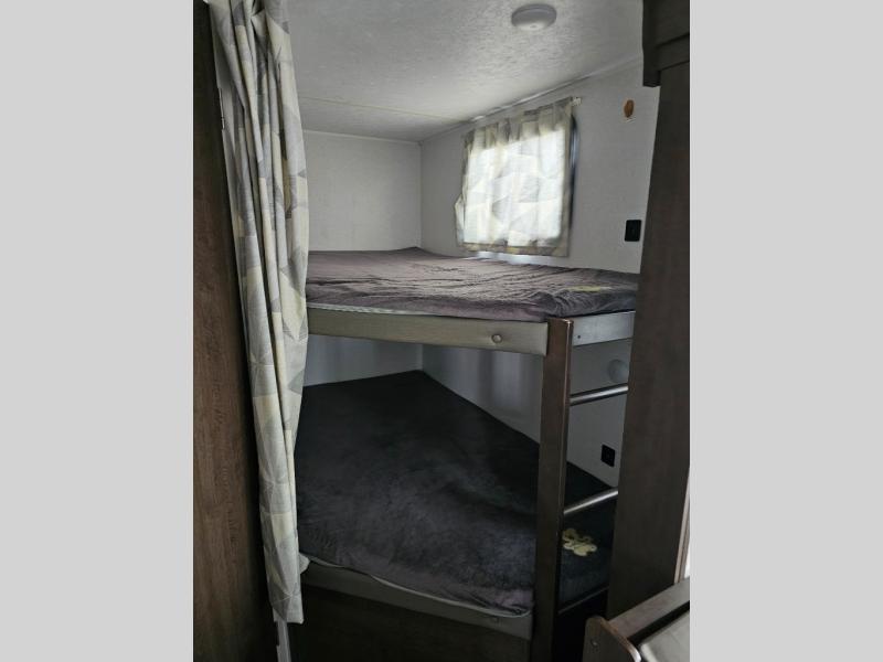 Grab the kids and a few of their friends for a weekend get-a-way! There is plenty of room for everyone inside with a large slide out u-shaped dinette and sofa, plus dual entry doors make it easy for everyone to go in and out when loading and just normal daily use. You will especially love the quick access from outside into the full rear corner bath. Dual pantry storage inside allows you to stock up on goodies for the kids and their friends, and a large outside pass-through compartment keeps all of the outdoor gear and yard games neat and organized when not in use. At night, you can relax and enjoy the camp atmosphere with a fire and s'mores and an 18' awning to kick back under even after dark. When you head inside for the night, there is plenty of sleeping for everyone with double bed bunks in the back for the kids, and a private bedroom with queen bed up front for you and your spouse. You can even use the u-shaped dinette and sofa if needed for extra overnight guests. Enjoy this full-featured unit with all the amenities you need and want to be comfortable for any outdoor adventure!