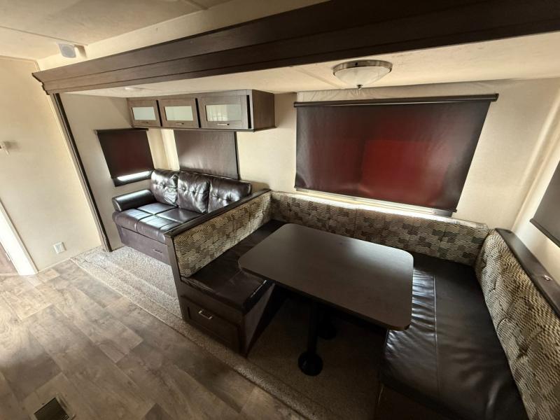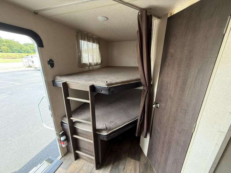 Set out to new destinations and make new memories camping in this single slide out travel trailer. This model features a rear set of bunk beds that your kids will just LOVE! The slide out within the living area includes a U-shaped dinette and a sofa that is perfect for an overnight guest. With the front private bedroom, the bunk beds, plus the U-dinette and sofa, you can comfortably sleep eight people for a fun weekend. Outside, the 16' awning provides plenty of shade from the sun, and you can easily fix snacks at the outside camp kitchen.
