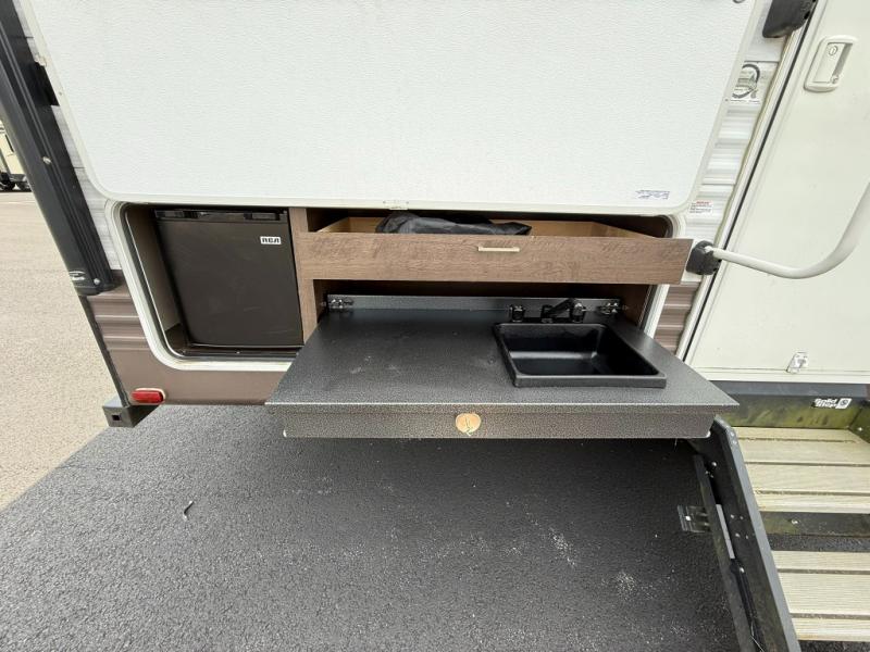 With any Wildwood travel trailer you will be pleased with new upgraded Shaw linoleum, convenient stow and go storage under the dinette, and USB ports in the bedrooms and bunks to keep you connected to the outside world. Each unit features a 10.7 cu.ft. 12V Everchill stainless steel refrigerator, new modern cabinet door hardware, and a stainless steel roll up sink cover. You'll appreciate the pass through storage for all your camping gear, an LED awning light for evenings outdoors, and each model comes with Furrion backup camera prep to make parking hassle free.