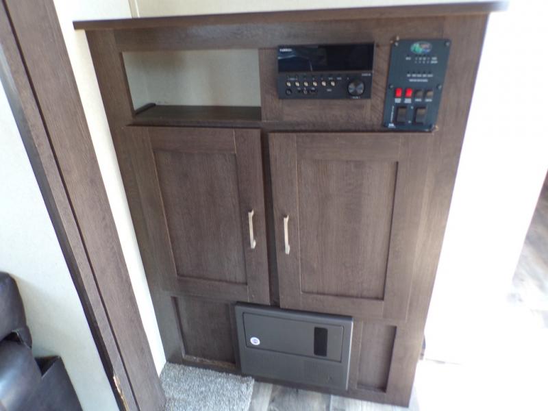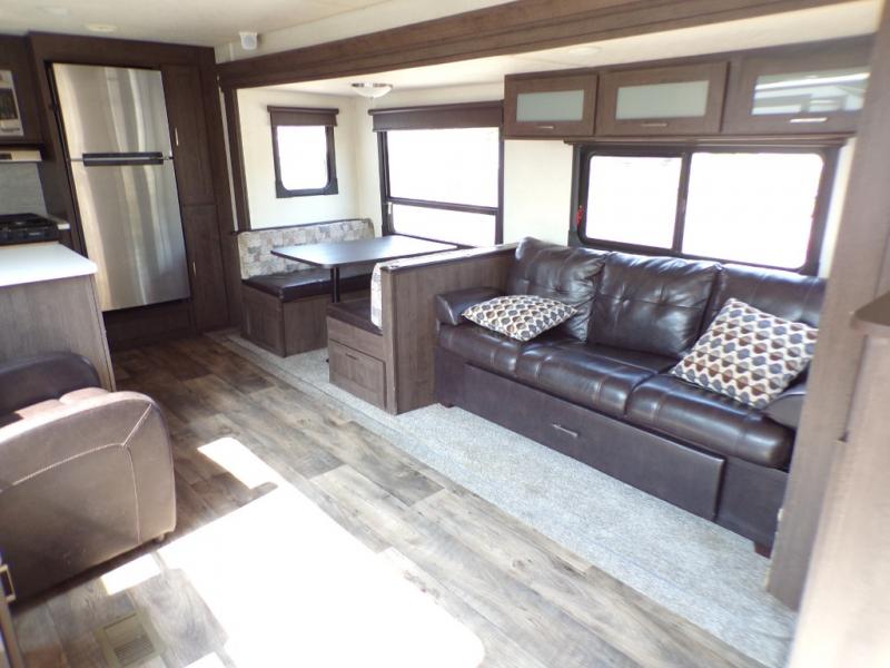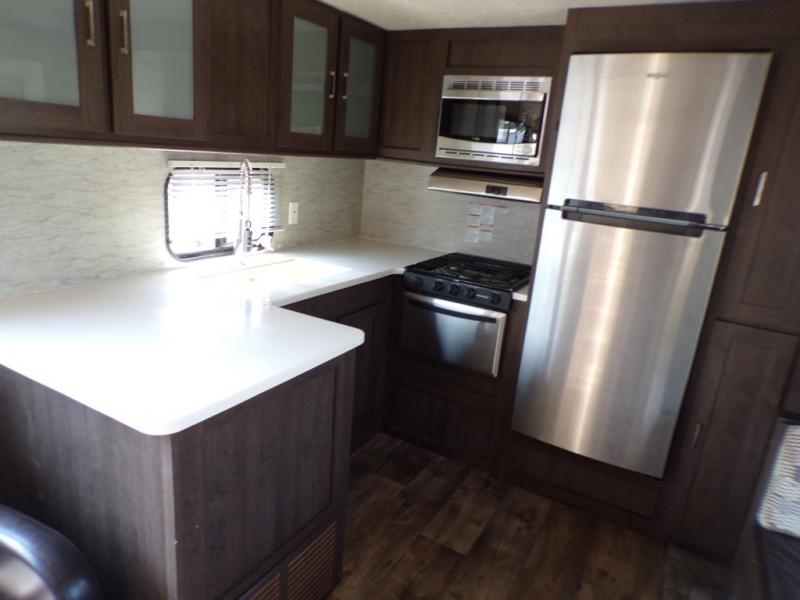 With any Wildwood travel trailer you will be pleased with new upgraded Shaw linoleum, convenient stow and go storage under the dinette, and USB ports in the bedrooms and bunks to keep you connected to the outside world. Each unit features a 10.7 cu.ft. 12V Everchill stainless steel refrigerator, new modern cabinet door hardware, and a stainless steel roll up sink cover. You'll appreciate the pass through storage for all your camping gear, an LED awning light for evenings outdoors.