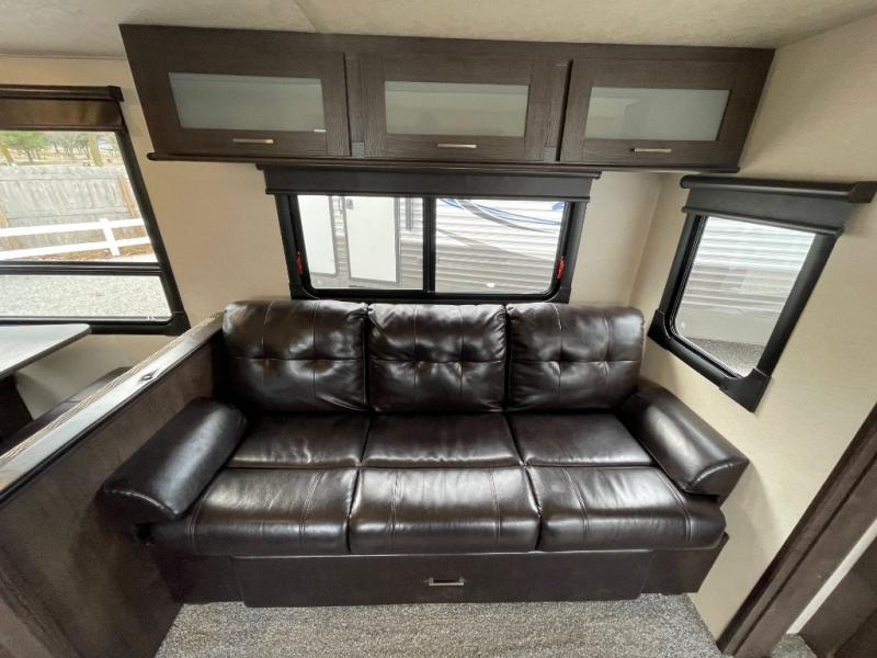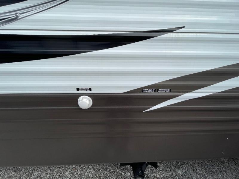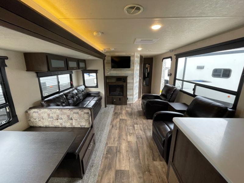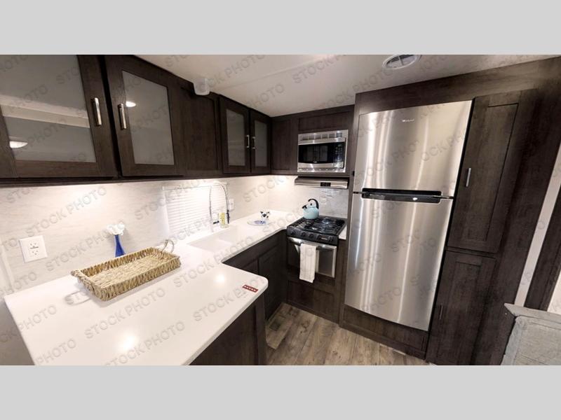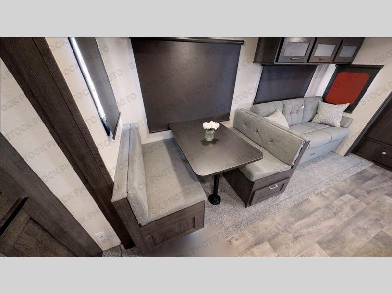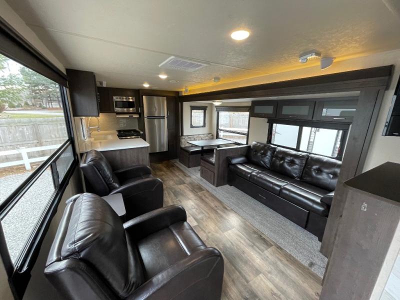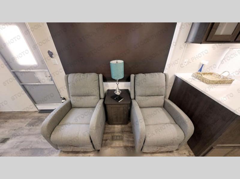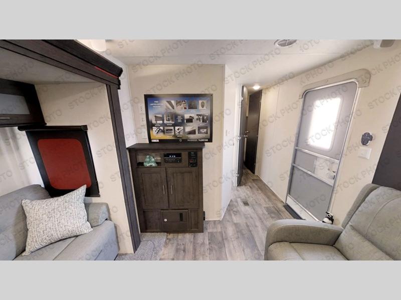 This model is great for a medium sized family. There is a rear kitchen that is great for prepping meals, enjoying them together, and then cleaning up afterward. The sofa, booth dinette, and two recliners are perfect for relaxing, playing games, or just enjoying one another's company. The sofa and dinette both fold down into sleeping space at night if needed. There is also plenty of storage throughout this unit, with overhead cabinets and wardrobes on the inside, there is some pass through storage outside as well. Put up the 16' awning, add a couple of camp chairs and enjoy the great doors with a little bit of shade.