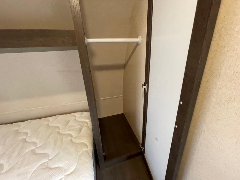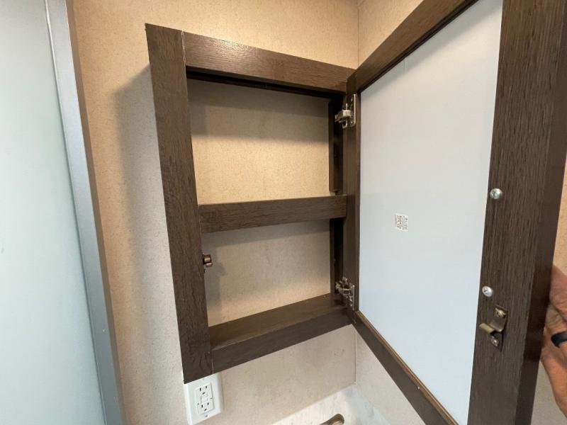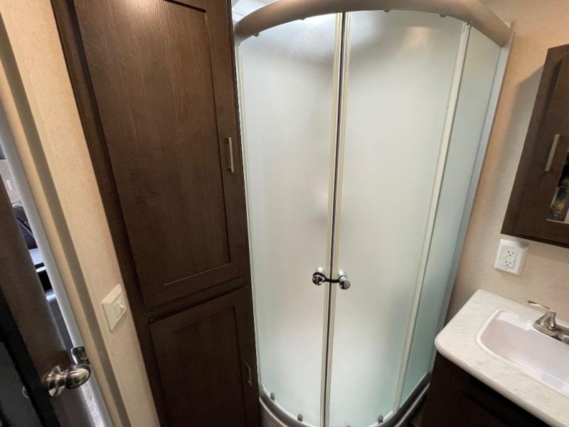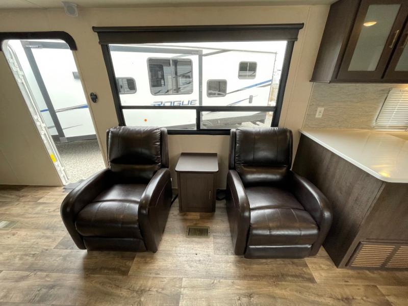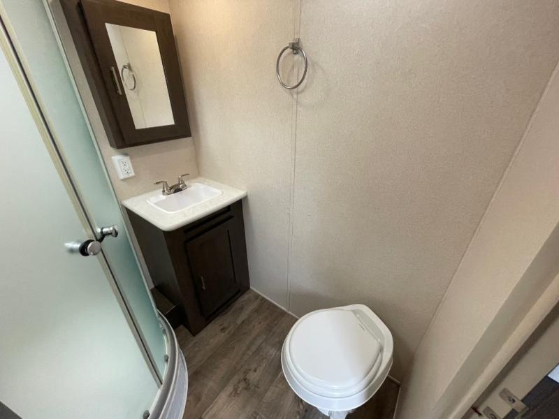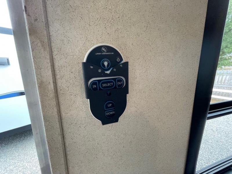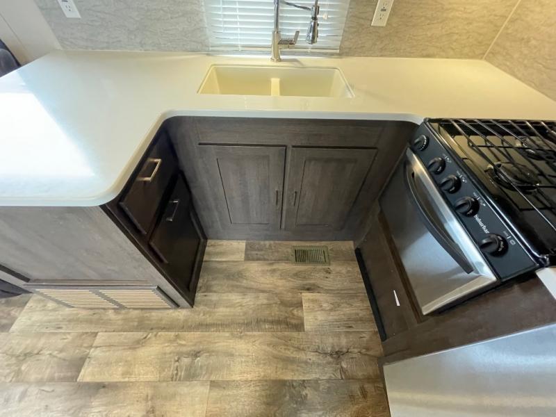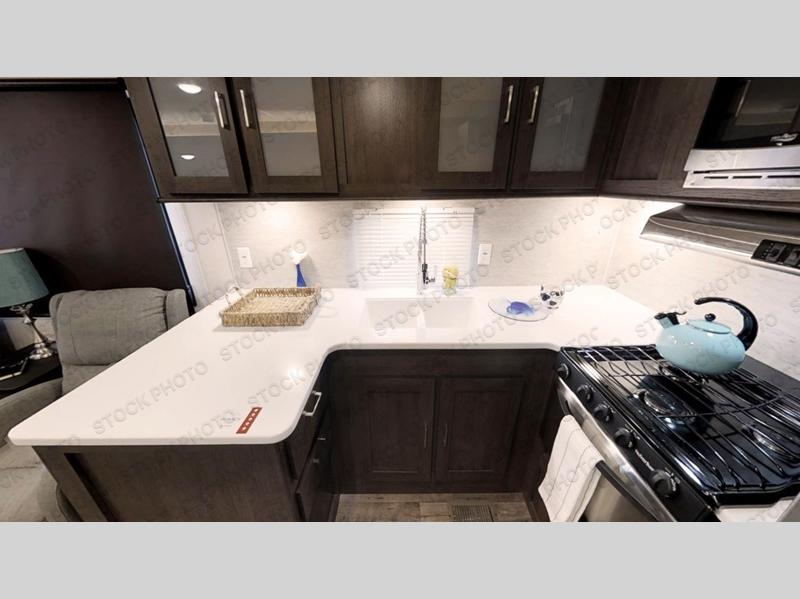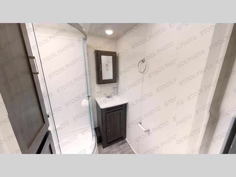 This model is great for a medium sized family. There is a rear kitchen that is great for prepping meals, enjoying them together, and then cleaning up afterward. The sofa, booth dinette, and two recliners are perfect for relaxing, playing games, or just enjoying one another's company. The sofa and dinette both fold down into sleeping space at night if needed. There is also plenty of storage throughout this unit, with overhead cabinets and wardrobes on the inside, there is some pass through storage outside as well. Put up the 16' awning, add a couple of camp chairs and enjoy the great doors with a little bit of shade.