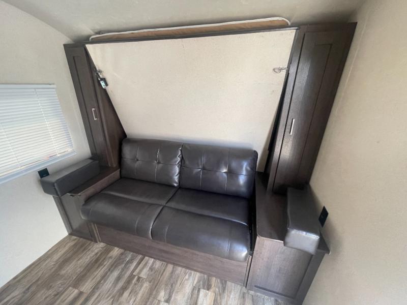 This versatile Wildwood FSX travel trailer is the perfect travel companion for an adventurous couple or family of three. Depending on the time of day, you can either step into a living space up front or a bedroom area if the bed is folded down. This Murphy bed design gives you so many options, and you don't ever have to make your bed! You will also appreciate the rear full bath complete with a 24" x 36" shower. With double wardrobes up front, a large linen closet in the bath area, a pantry, and overhead storage, there is certainly ample storage space throughout!