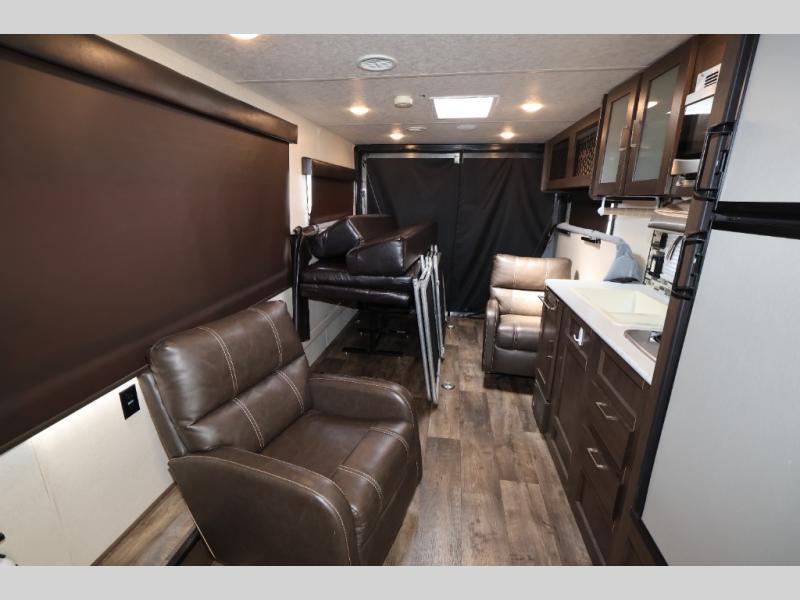 When the great outdoors is calling your name, then load up your riding toys, your camping gear, and set out to your favorite campground with this Wildwood FSX toy hauler. You can easily load and unload your off-road toys with the 90" x 75" ramp door with rail kit. More storage can be found in the exterior pass-through storage area along the front. Seating space can be found at the flip-out sofas which can transform into additional sleeping space at night. The walk-through bathroom has all of the modern conveniences, such as a radius shower, toilet, and sink, and when you are ready to call it a day, then head to the front bedroom where you will find a queen-size bed.
