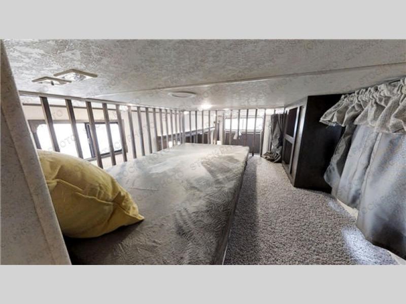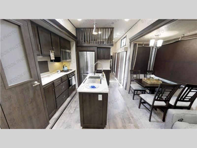 Come choose a quiet spot in the woods for your Wildwood Grand Lodge 42DL destination trailer by Forest River. This model features triple slide outs and a loft with three bunk mats that your children or grand children will love. The double entry doors include a set of patio doors for the main entry plus a private entry door that leads into the front master bedroom. You will love the large walk-in pantry for all of your non-perishables, and the kitchen island which provides extra counter space to prep and serve your meals, plus added storage beneath for your larger pots and pans. The kitchen also features a skylight for added natural light making it seem bright even on cloudy days!