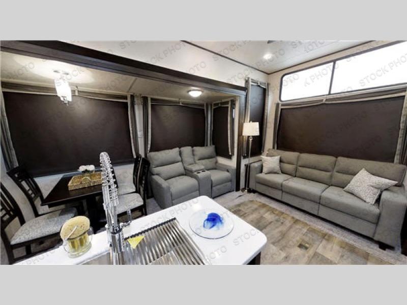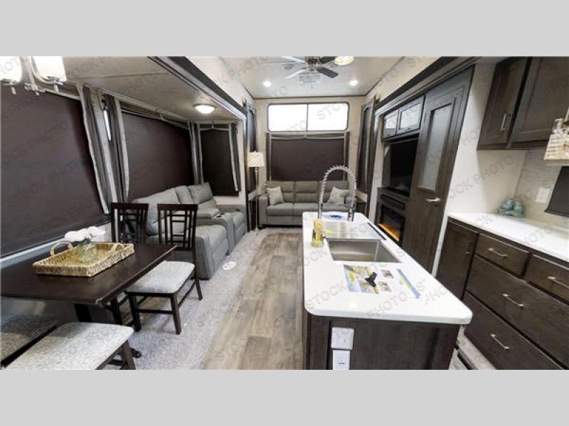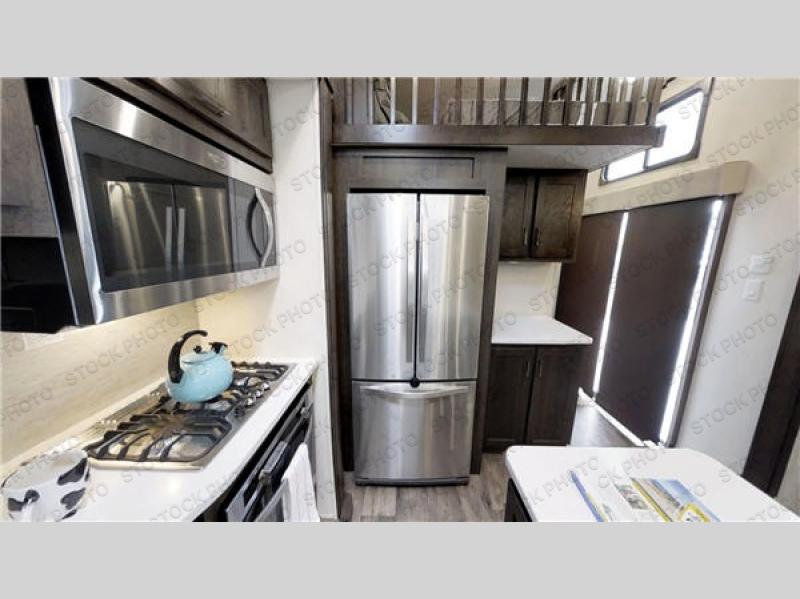 Functionality plus at-home comforts describe the Wildwood Grand Lodge destination trailer from Forest River. You will love all of the new features and upgrades like the extra large windows to bring the view or your surroundings right inside, the new taller ceiling height which provides a spacious and airy feel. You will also appreciate the upgraded cabinet door fronts on the island, the 80" extra wide sofa, plus the Whirlpool brand french door residential refrigerator and 1.6 cu. ft. oversized Whirlpool microwave oven for all of your extended stay needs. With the Wildwood Grand Lodge, you truly get a home-away-from-home with all of the conveniences that make travel fun, right on down to the housekeeping with central vacuum being included, plus so much more!