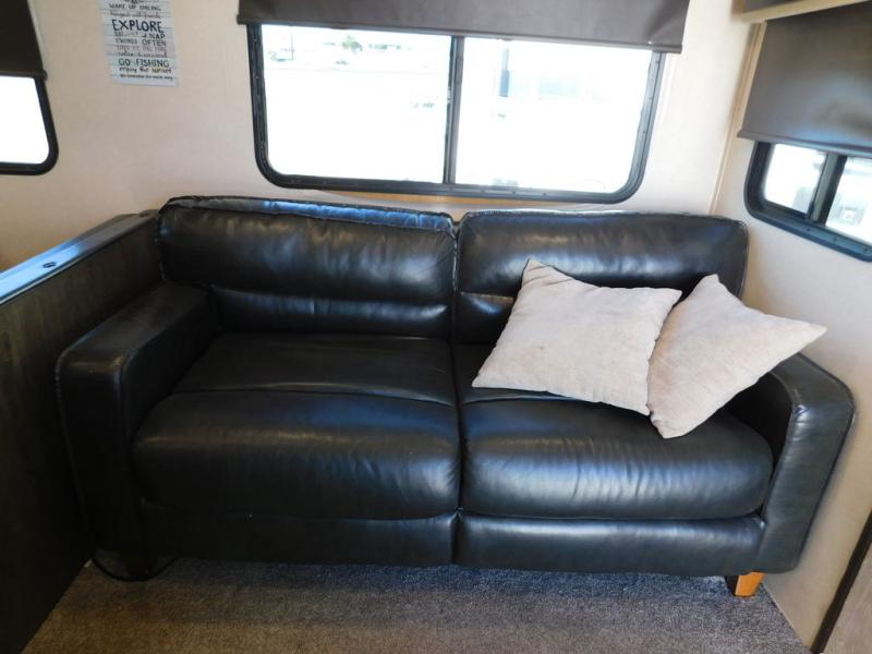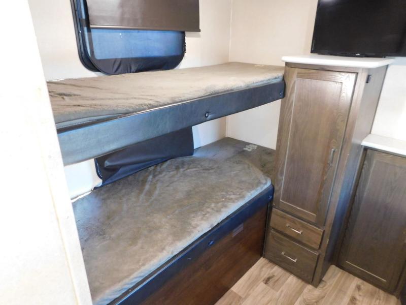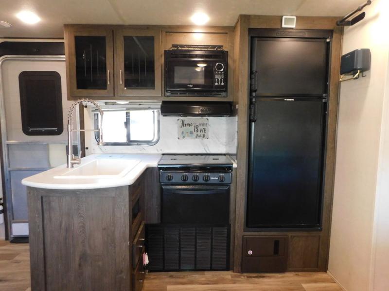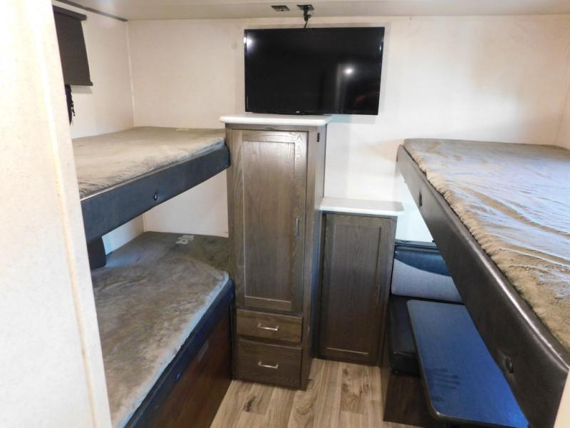 Invite the grandparents and the cousins for a family vacation in this travel trailer. With triple bunks and a dinette in the bunkhouse, a U-shaped dinette and a tri-fold sofa in the main living area, plus a queen bed in the front private bedroom, you can sleep nine to ten campers each night. There are lots of storage options throughout the interior for everyone's things, plus there is an exterior front pass through storage for the larger items. You will appreciate all the kitchen appliances to make meals and snacks the whole time, plus you can choose the exterior kitchen option for an even more fun camping experience!