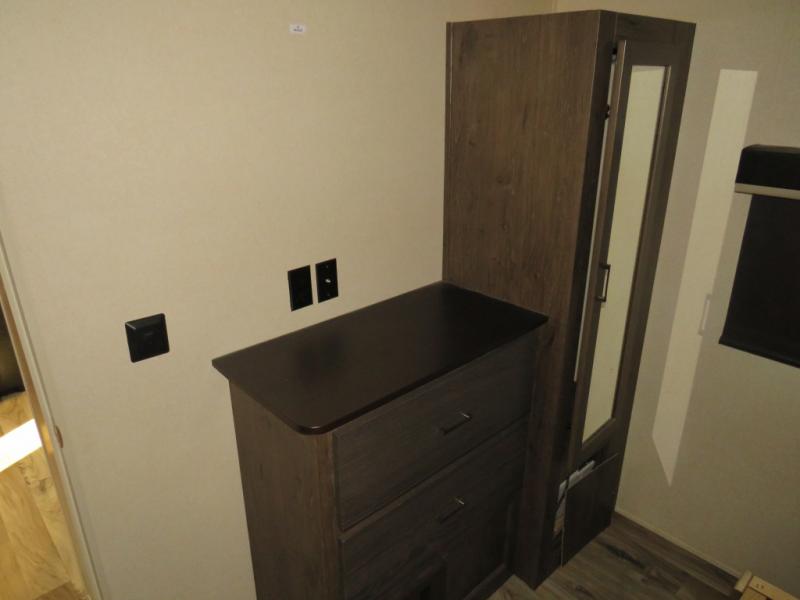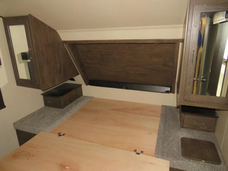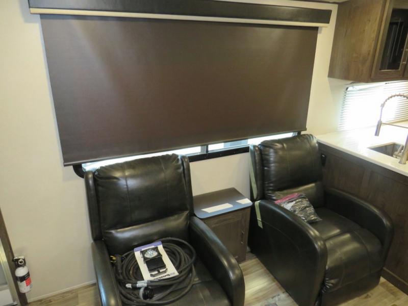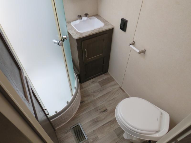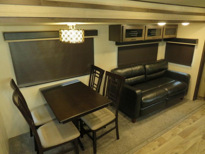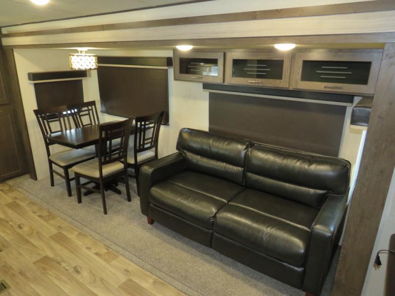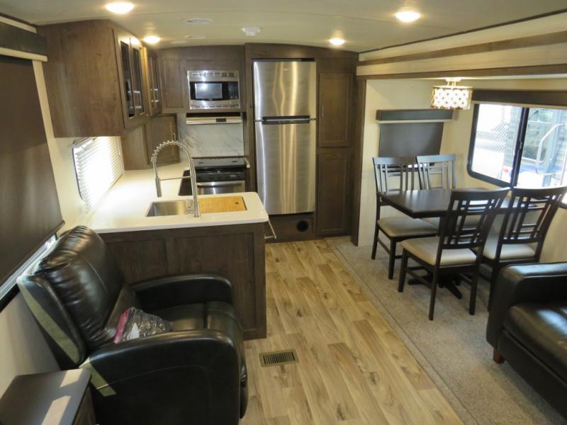 When you want time away from home, but yet want the comforts of home, then choose a Wildwood Heritage Glen LTZ travel trailer by Forest River. These models have plenty of residential features such as a stainless steel Dometic double door refrigerator, an under mount sink, stain resistant carpet in the living room and Beau plank wood linoleum in the kitchen. Along the exterior you will find an aerodynamic front cap with LED light strips, gel coated fiberglass exterior, and marine grade exterior speakers with a blue LED light. The One Touch electric awning provides plenty of shade and allows you to instantly have a nice outdoor living space and more!