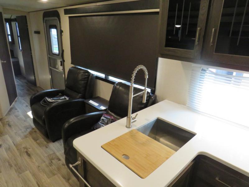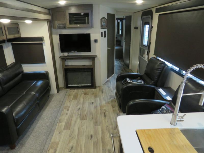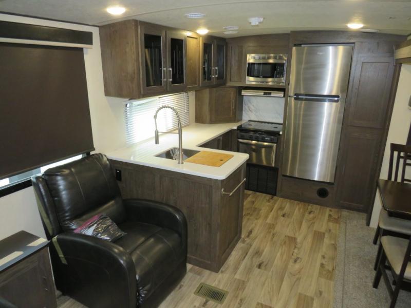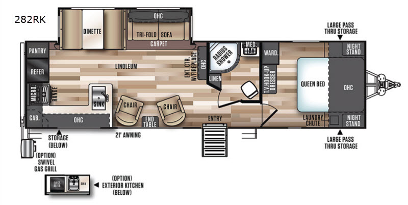For your next camping trip you will want this single slide out Wildwood Heritage Glen LTZ 282RK travel trailer in tow. Your family of five can camp in comfort and style with this travel trailer. Outside there is a 21' awning which provides plenty of shade plus maximizes your outdoor living space. With the large pass through storage area you will have enough room for all of your camping gear. This model also has an optional exterior kitchen as well as an optional swivel gas grill which makes cooking outdoors easy. Inside you will find plenty of living space with the single slide out along the roadside. The rear kitchen has plenty of counter space as well as overhead cabinets. In the evening you can watch a favorite movie or TV show at the living room 32" HD TV and enjoy a fire in the fireplace.