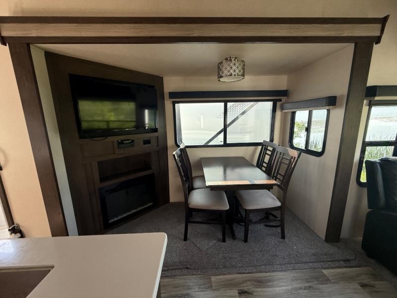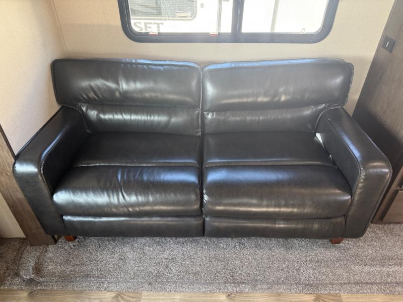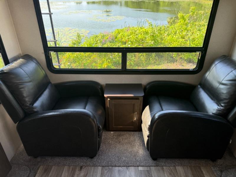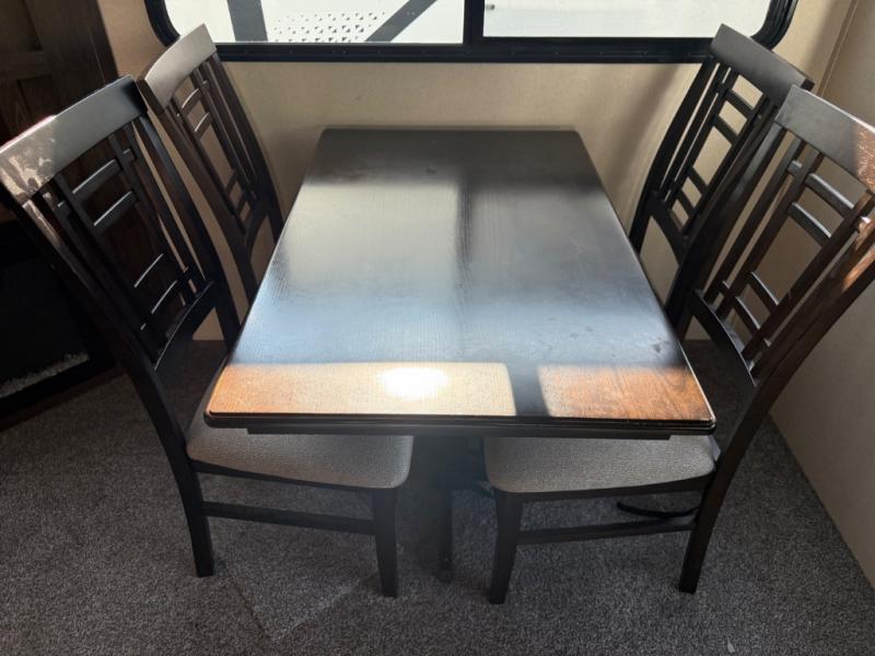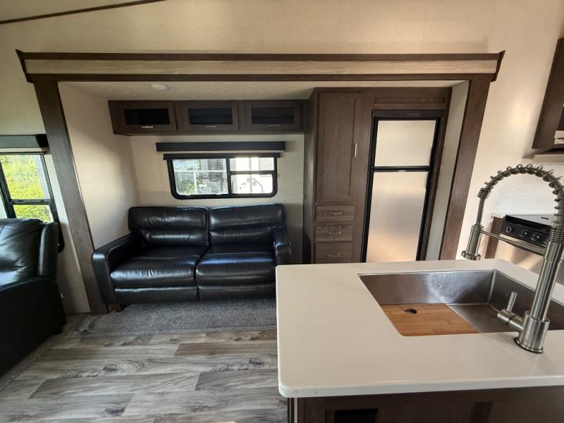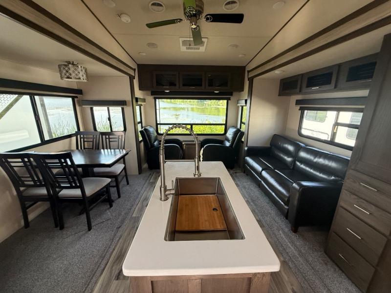 Come enjoy your next camping trip with this fifth wheel. You will find plenty of interior living space with three slide outs. The rear living area features comfortable seating at the lounge chairs or on the tri-fold sofa. You will love the kitchen island plus plenty of counter space for meal prep. Bath time for the little one's is easier than ever with a residential tub with a seat. The front private bedroom includes a custom king bed, plus a large wardrobe that has been prepped for an optional washer and dryer, plus so much more!