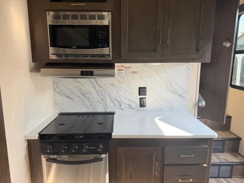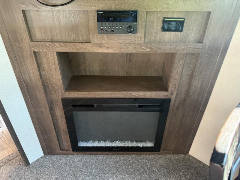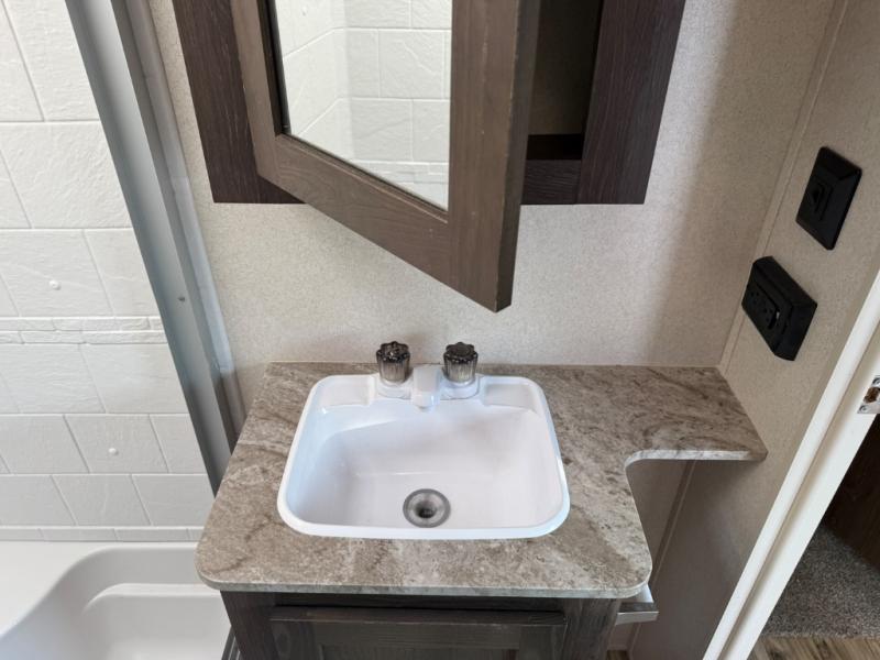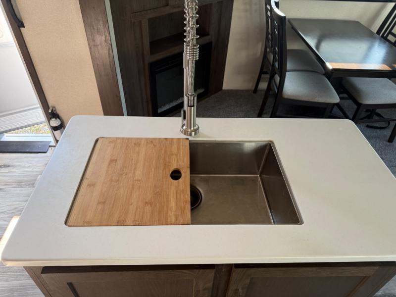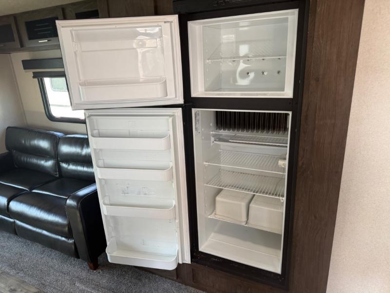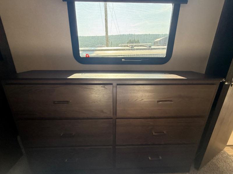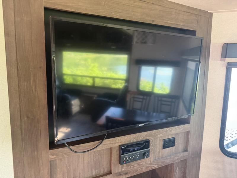 Come enjoy your next camping trip with this fifth wheel. You will find plenty of interior living space with three slide outs. The rear living area features comfortable seating at the lounge chairs or on the tri-fold sofa. You will love the kitchen island plus plenty of counter space for meal prep. Bath time for the little one's is easier than ever with a residential tub with a seat. The front private bedroom includes a custom king bed, plus a large wardrobe that has been prepped for an optional washer and dryer, plus so much more!