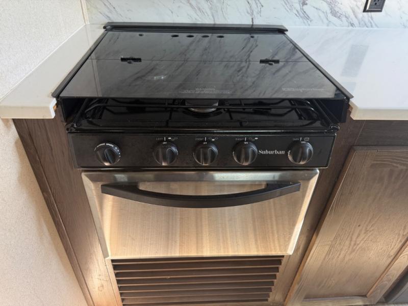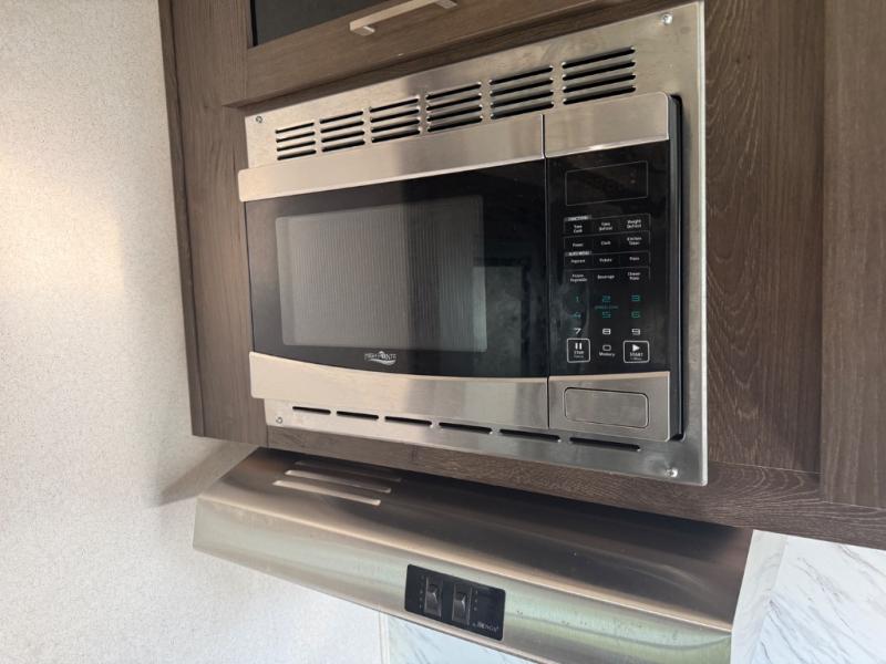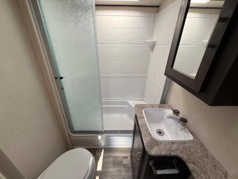 When you want time away from home, but yet want the comforts of home, then choose a Wildwood Heritage Glen LTZ travel trailer or fifth wheel by Forest River. These models have plenty of residential features, such as a stainless steel Everchill residential refrigerator, decorative Midnight Metal subway style backsplash, stain resistant carpet in the living room, and Shaw Guardian Hickory Way linoleum in the kitchen. Along the exterior you will find a full wrap around aerodynamic front cap with LED lights, a gel coated fiberglass exterior, and marine grade exterior speakers with a blue LED light. The electric awning with LED lights provides plenty of shade and allows you to instantly have a nice outdoor living space and the outside shower provides a place to wash off the sand from the lake or fill the dogs water bowl!