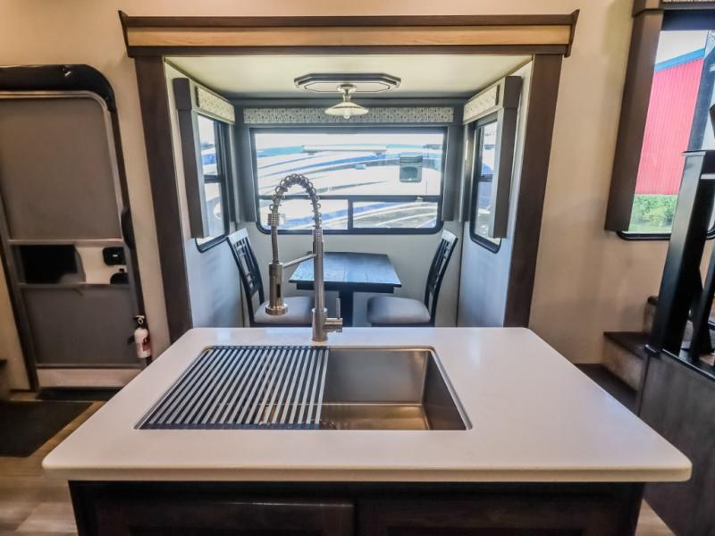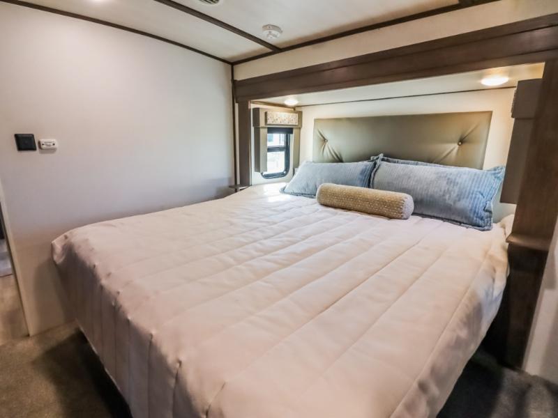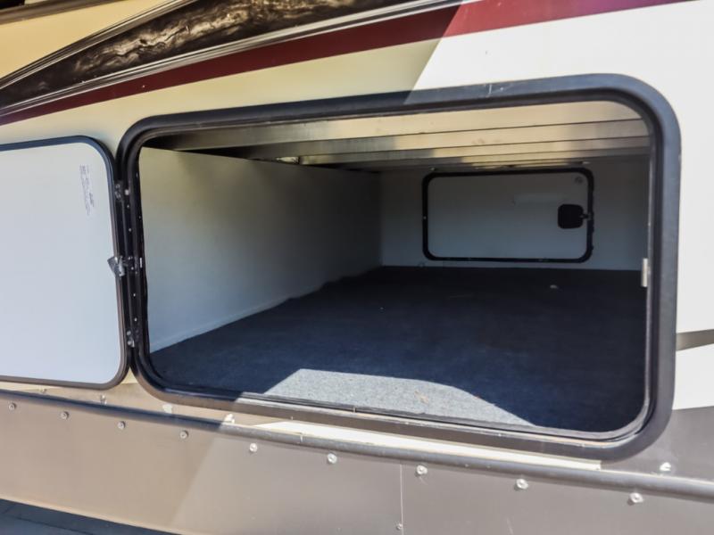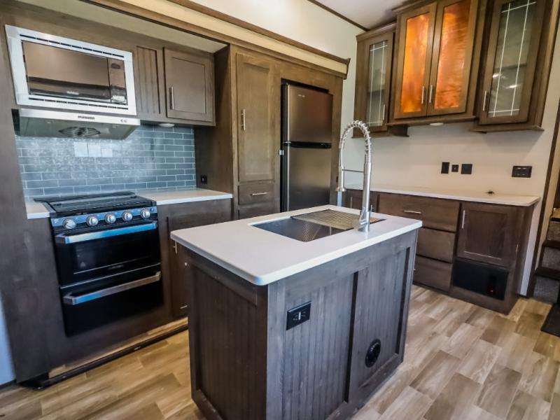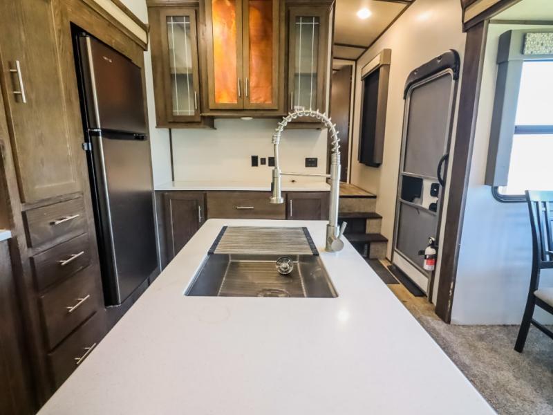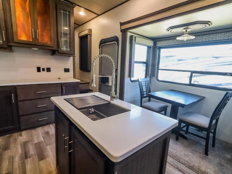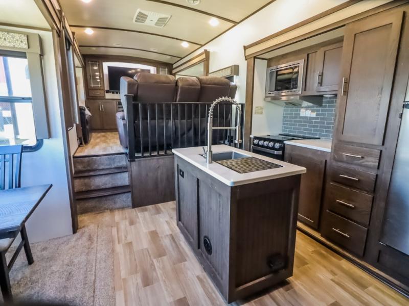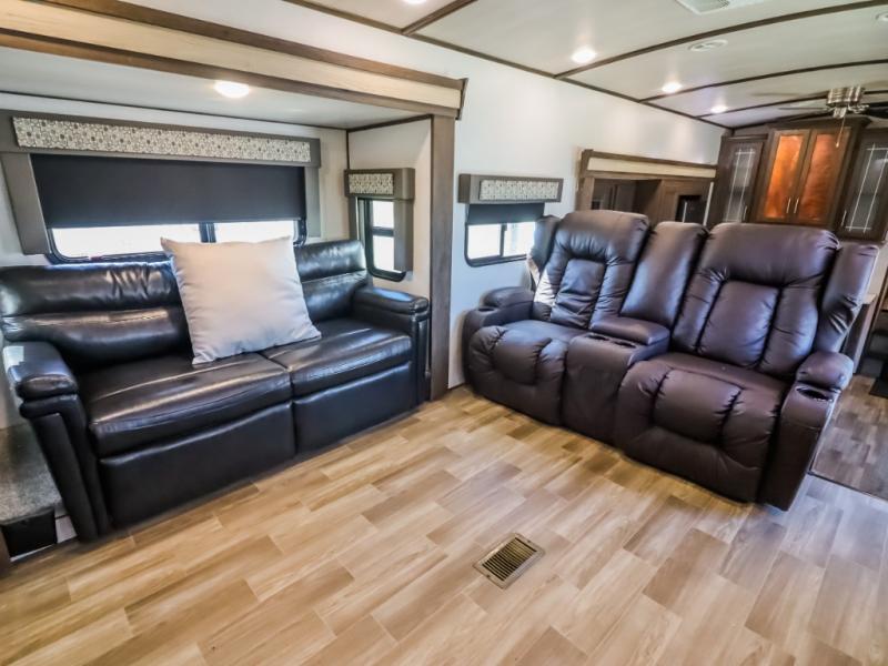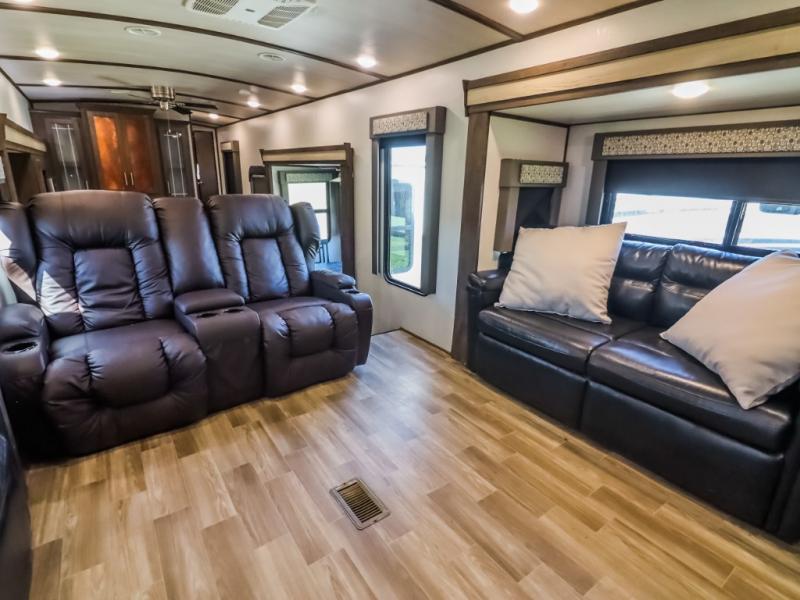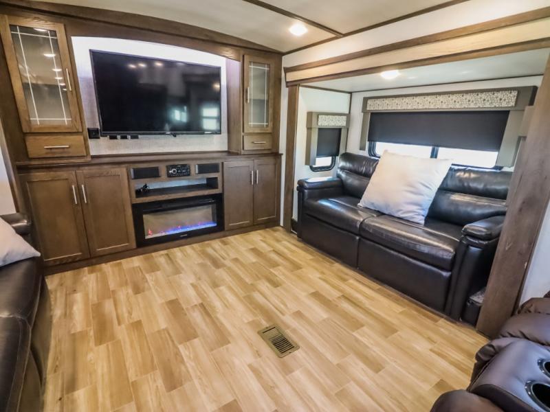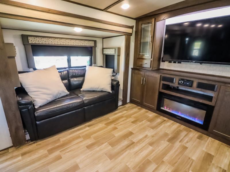 This fifth wheel with five slide outs has all the amenities you're used at home, plus some! You'll find sleeping space for six in this unit. The two tri-fold sofas are perfect for the kids or for extra guests, while you enjoy the custom king bed in the front private bedroom. You can cook dinner just like you do at home with a kitchen island, a three burner cooktop, plus there is a pantry for your dry goods. Everyone will appreciate the full bath with a residential tub with a seat for easy clean-up. This fifth wheel features three pass through storage's, so you don't have to leave anything behind. Bring the fishing poles, extra lawn chairs, and the kids' scooters!