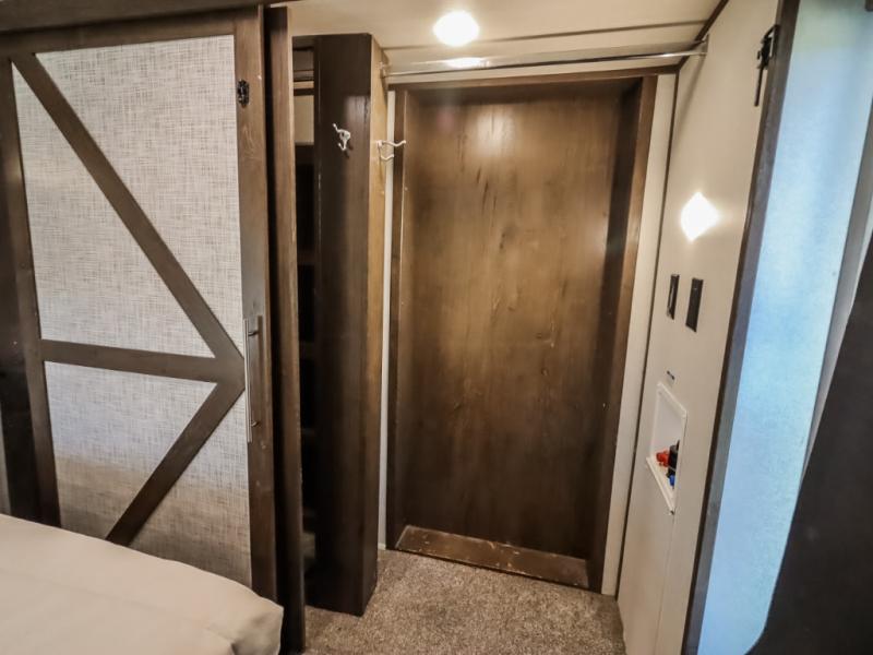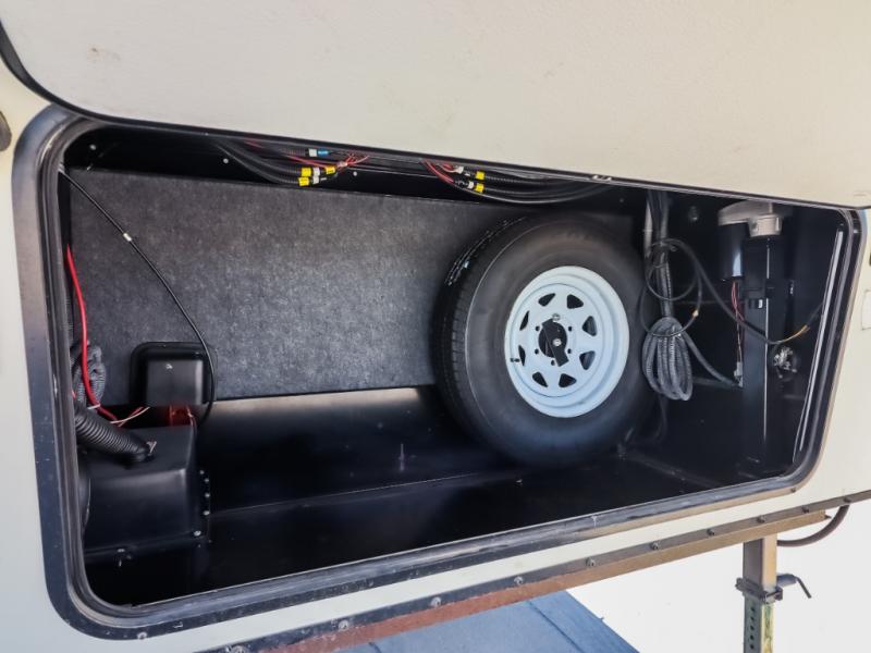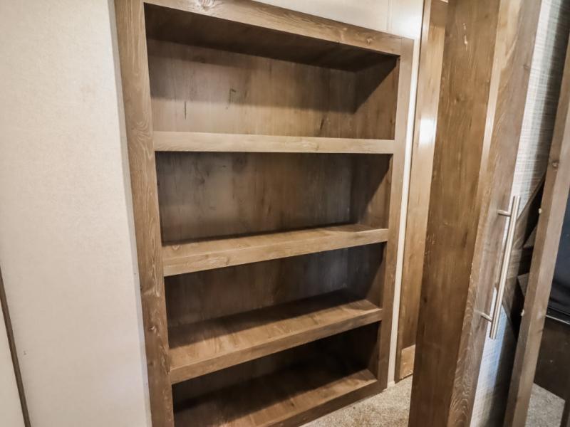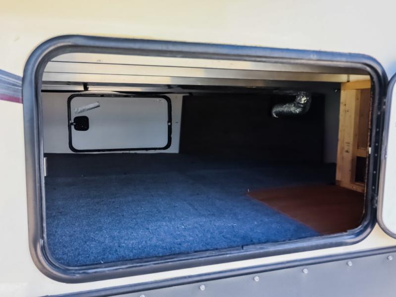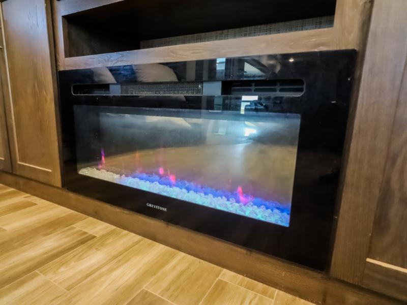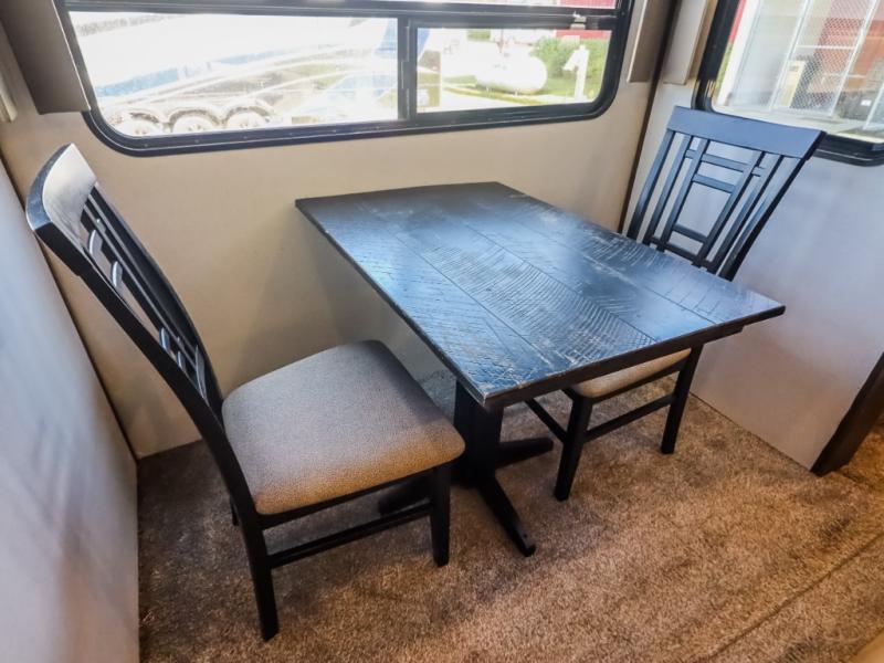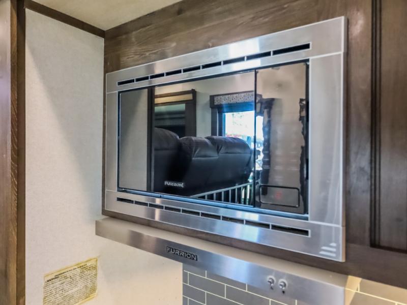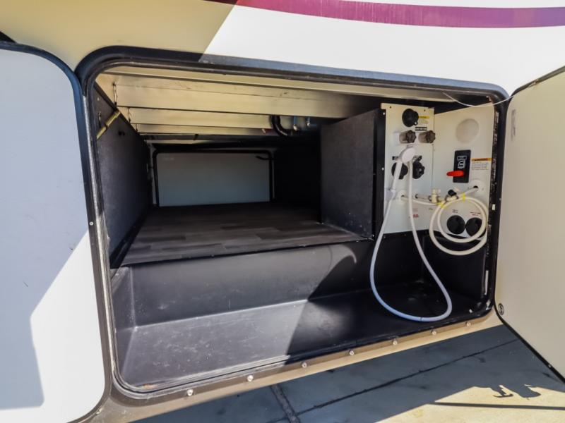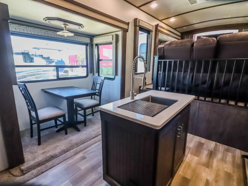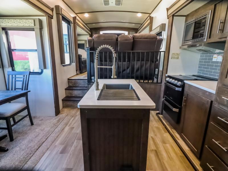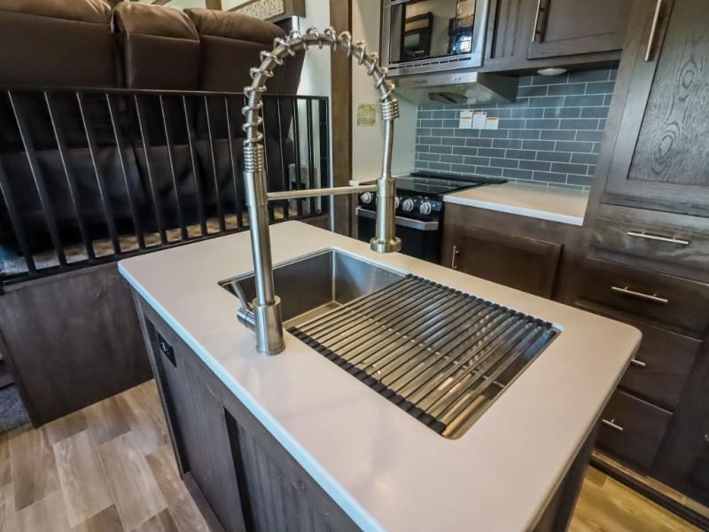 This fifth wheel with five slide outs has all the amenities you're used at home, plus some! You'll find sleeping space for six in this unit. The two tri-fold sofas are perfect for the kids or for extra guests, while you enjoy the custom king bed in the front private bedroom. You can cook dinner just like you do at home with a kitchen island, a three burner cooktop, plus there is a pantry for your dry goods. Everyone will appreciate the full bath with a residential tub with a seat for easy clean-up. This fifth wheel features three pass through storage's, so you don't have to leave anything behind. Bring the fishing poles, extra lawn chairs, and the kids' scooters!