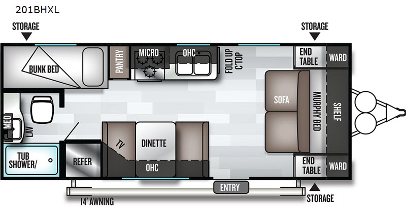 Load up your family and head on out to your favorite campground with this Wildwood X-Lite 201BHXL travel trailer. Your kids can have their own sleeping space at the rear bunk beds while mom and dad can have the Murphy Bed. During the day after the bed is put away then you can easily set up the sofa for a nice front living area. With the convenience of the rear bathroom now you won't have to use the campground facilities. The 14' awning provides plenty of shade during the day and helps to maximize your outdoor living space, plus there is exterior storage for you to bring along all of your outdoor gear!