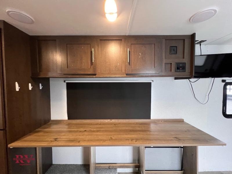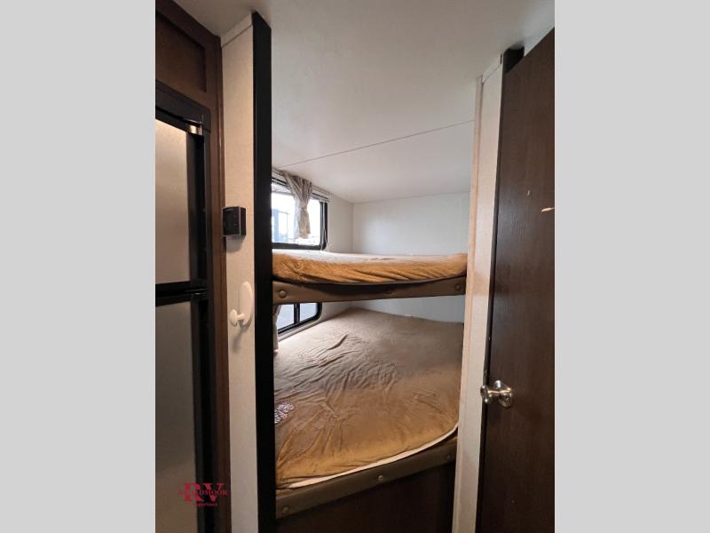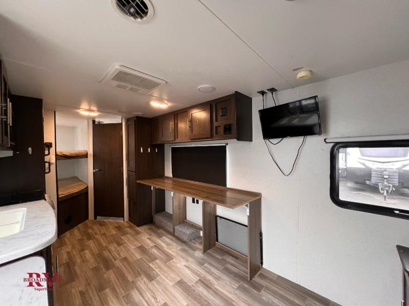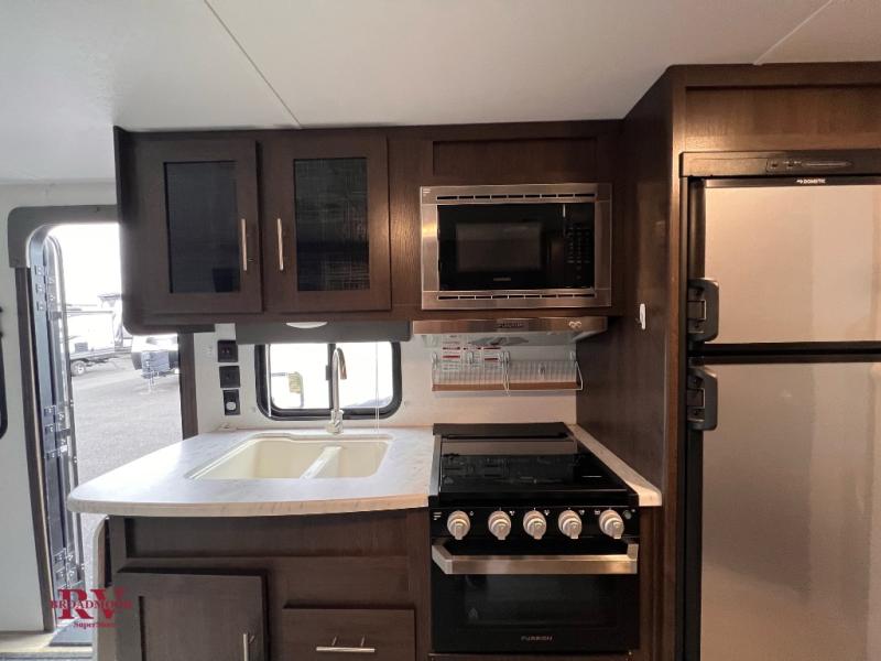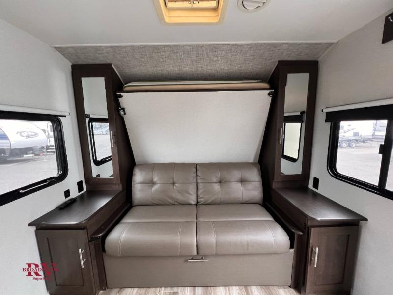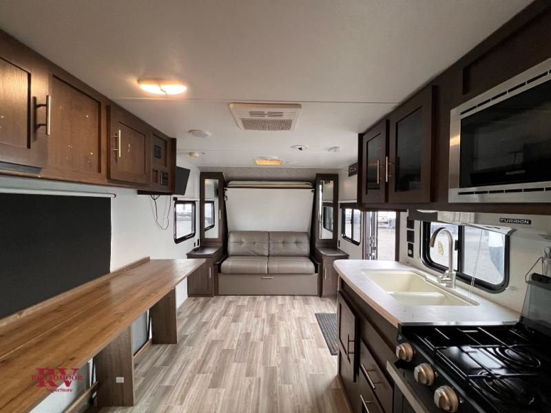 Round up the kids and head into this Forest River Wildwood X-Lite 220BHXL travel trailer. It features a rear set of double bunk beds that your kiddos are sure to love and you will love that they are located right next to the rear bathroom to help eliminate any late night accidents. You can easily whip up any of your best meals inside the kitchen with the three burner cooktop or you can even pop a bag of popcorn in the microwave, plus there is a 4.3 electric refrigerator for you to keep your perishables cold and fresh. Another convenient features is the Murphy bed, it can easily transform into a bed at night and a sofa during the day!