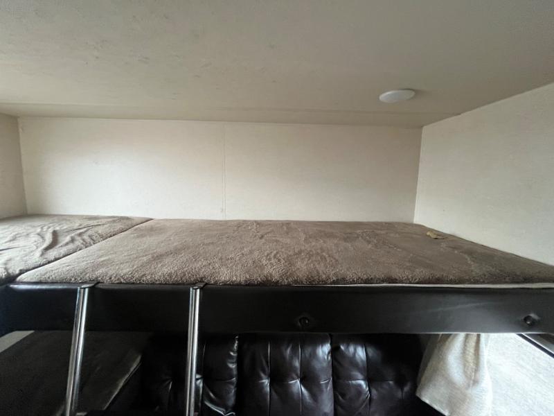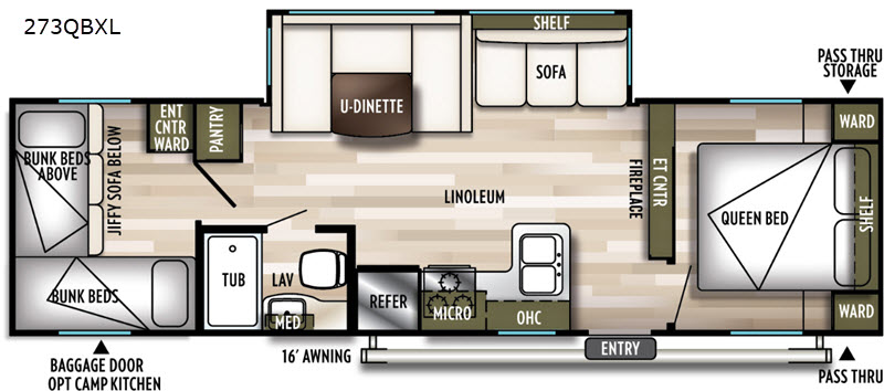 You will want each camping trip to extend just a little bit longer when you choose to camp with this Wildwood X-Lite 273QBXL. Your kids will enjoy the rear bunkhouse which has three bunk beds plus a jiffy sofa below one bunk, plus an entertainment center with a wardrobe. While the chef in the family is fixing the meals you can easily visit with your family since the kitchen and living area are open and spacious with the single slide out. You can enjoy your meals at the U-shaped dinette and at night this converts into additional sleeping space. The front bedroom is ideal for mom and dad. Here they can get a good night's rest on the queen bed plus there is storage with the wardrobes and overhead shelf. Maybe you prefer more time outdoors then you will want to add the optional camp kitchen!