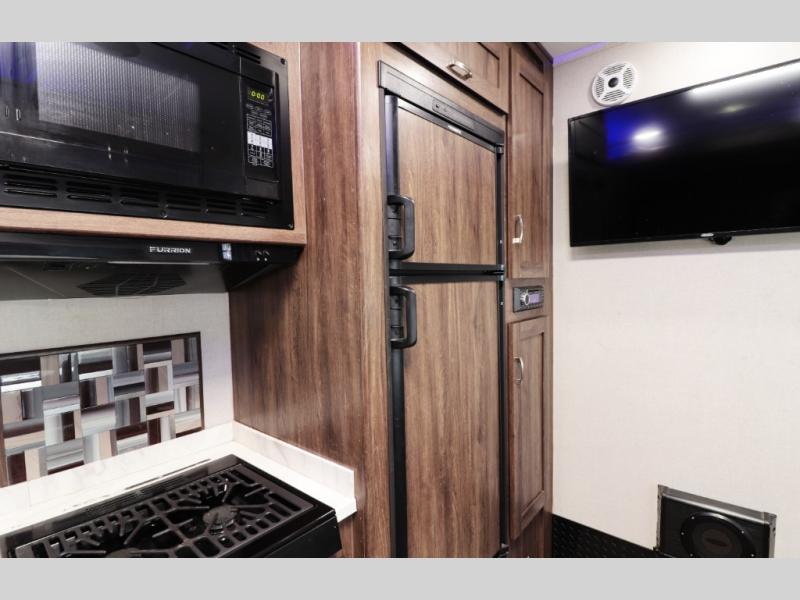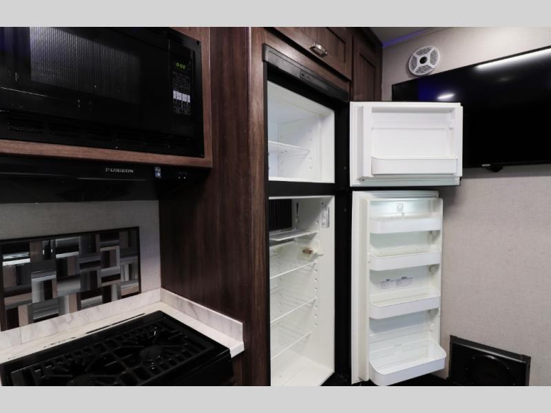 Entertainment & convenience package – the “Work and Play Package” (mandatory option) brings in 15,000 BTU ducted A/C, 8 cu ft refrigerator, convection microwave oven, 40? Jensen LED TV, AM/FM/DVD/MP3 Bluetooth stereo with app-control, spare tire/carrier and ready-for-generator wiring.