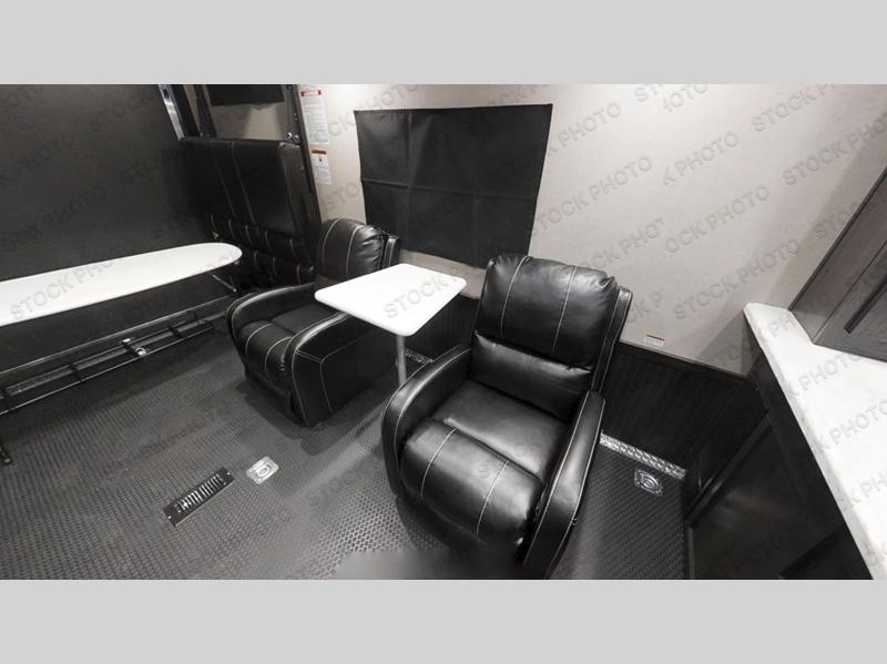 Take this XLR Nitro toy hauler travel trailer out on your next toy hauling adventure. You will love having an 8' Zero Gravity ramp door for easy loading and unloading. The garage area gives you around 14' for storing your toys while you are on the road and once everything is unloaded you have a pass-thru dinette and an electric bed, two recliners and a table to use! The 10' patio will be great for entertaining those guests on a nice sunshiny day. Once everyone is ready for sleep after a long day of fun, there is a king bed in the private front bedroom for mom and dad, and the electric bed comes down and you can fold down the dinette for a sleeping space or two.