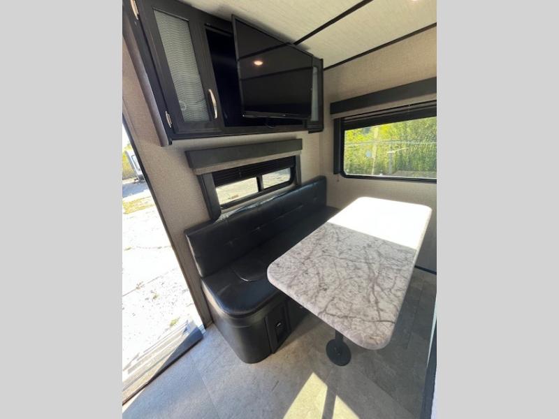 Imagine your next camping experience being comfortable and relaxing. Now imagine the kids sleeping on the front bunk beds while you enjoy a great night's sleep on the slide out queen bed in the rear while watching the 32" LED HDTV. The slide out offers more floor space for the removable table and bench providing seating for four to eat a meal at or play a card game before you head outdoors. The cook can whip up a full dinner with all the kitchen amenities, and the kids can grab snacks from the pantry. There is more living space outside under the awning as well. Take a step inside!