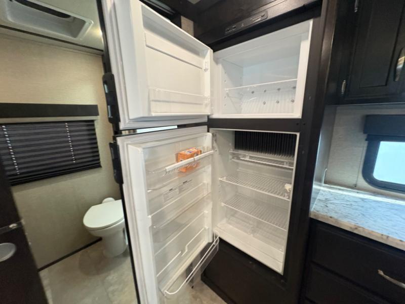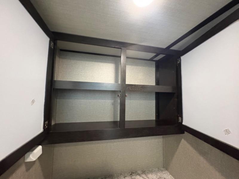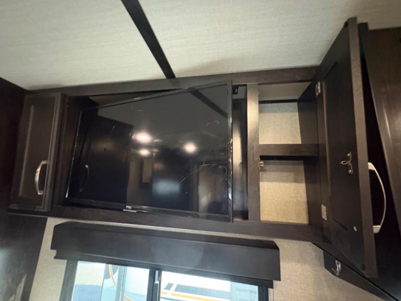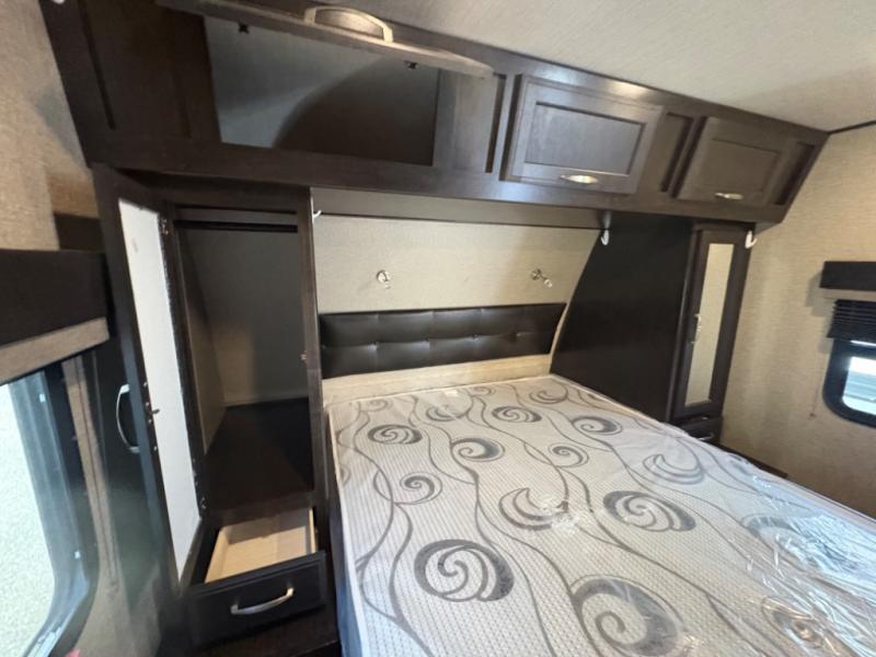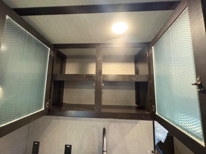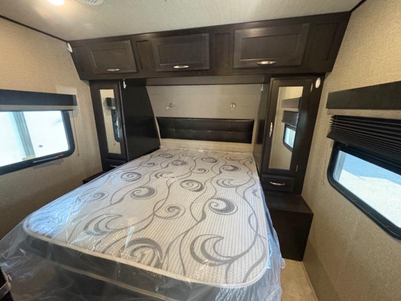 Toward the front, the private bedroom offers a peaceful retreat, complete with a walk-around queen bed, wardrobes, overhead cabinetry, and solid sliding doors for true nighttime privacy. This thoughtful separation of space makes the 22RBE ideal for couples who want a cozy home-on-wheels with the comforts of a traditional bedroom.