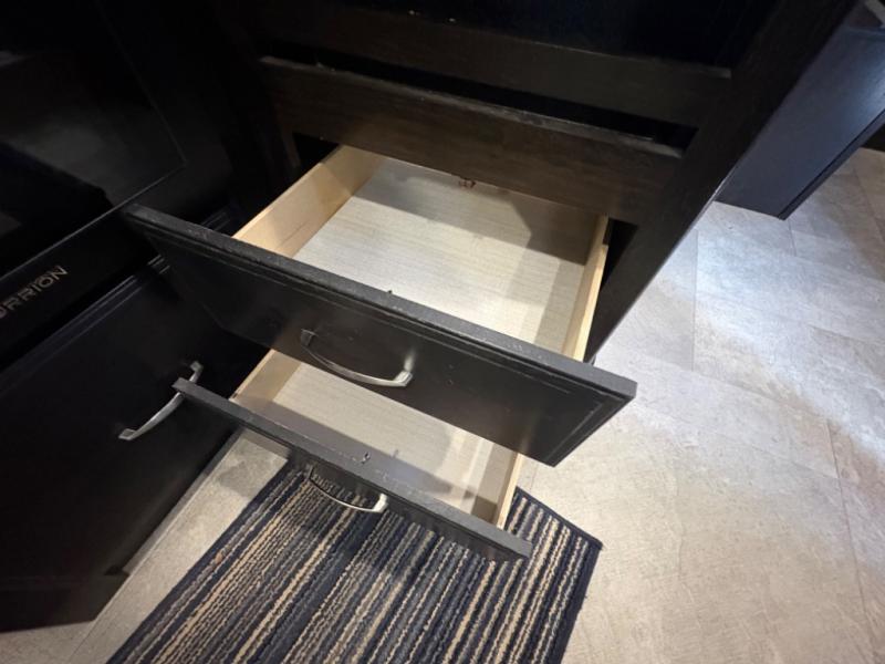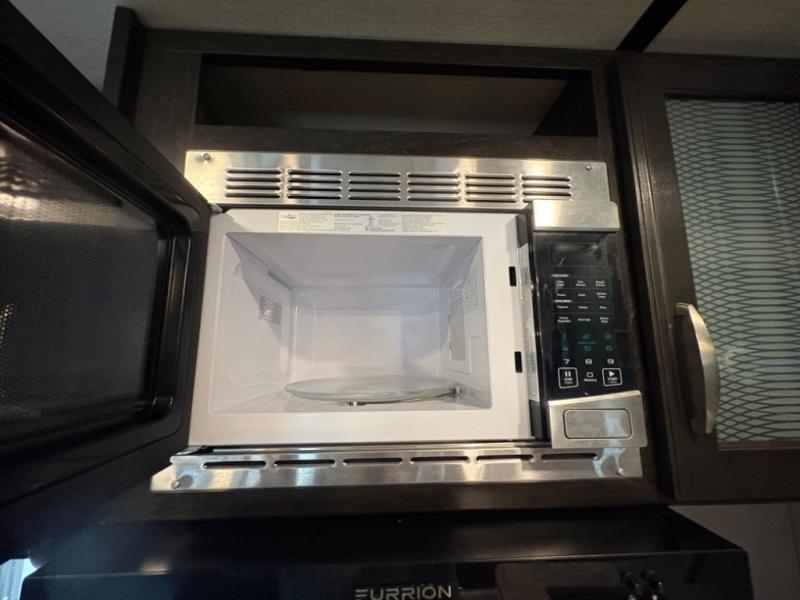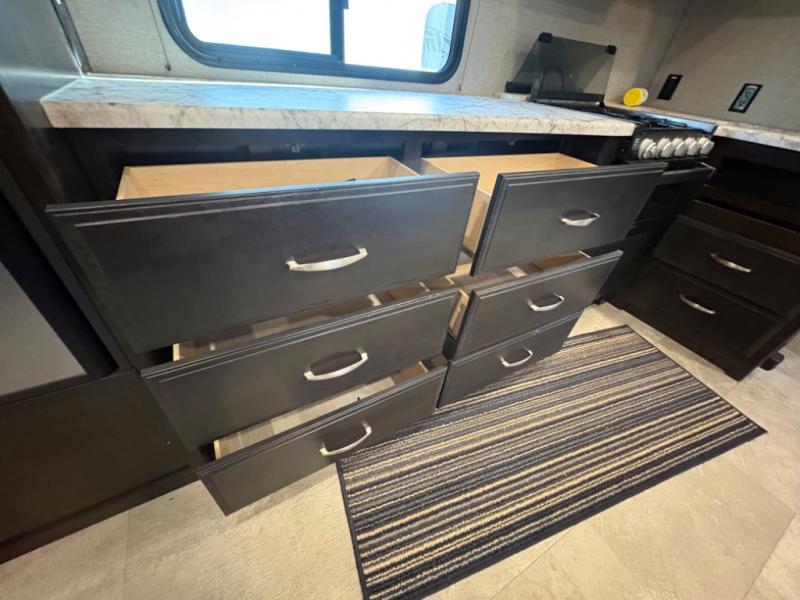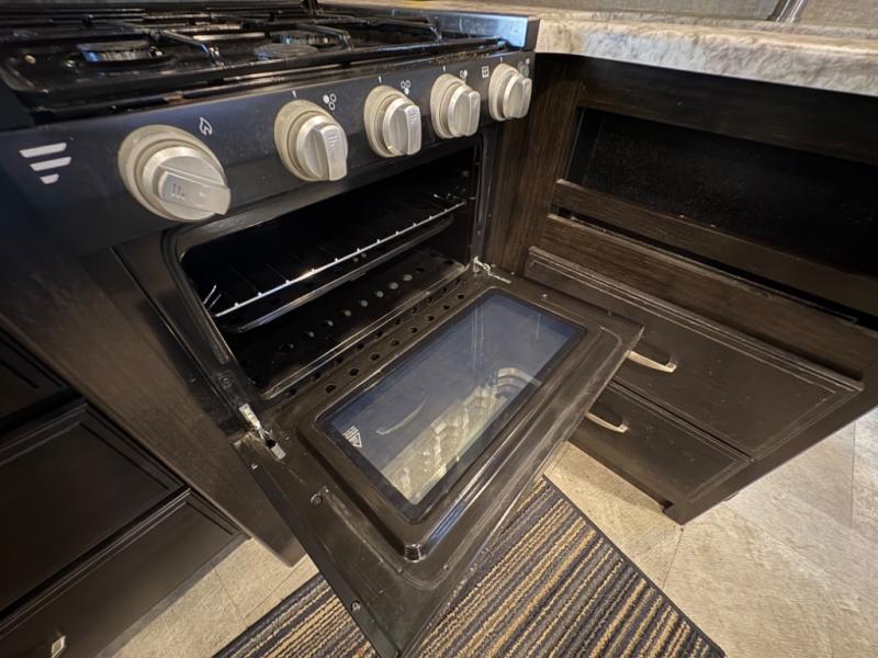 The living and kitchen area is equally impressive. The slide-out creates a comfortable entertainment and dining space, with a theater seating setup or dinette option depending on the configuration. Large windows bring in natural light and scenic campground views, while the well-equipped kitchen includes a three-burner cooktop, oven, microwave, stainless-steel sink, and ample storage for cookware and groceries. It’s a space designed for travelers who enjoy cooking real meals on the road.