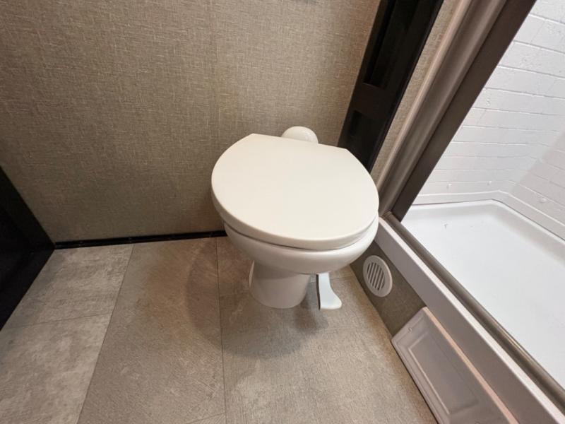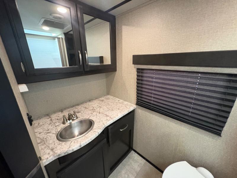Step inside and you’re greeted by a bright, open layout that feels far larger than its compact exterior suggests. The rear bathroom is a major highlight, offering a surprisingly spacious shower, generous counter space, and plenty of storage—an uncommon convenience in a lightweight towable. This large bathroom alone is a reason many RVers choose the 22RBE over other floorplans in its class.