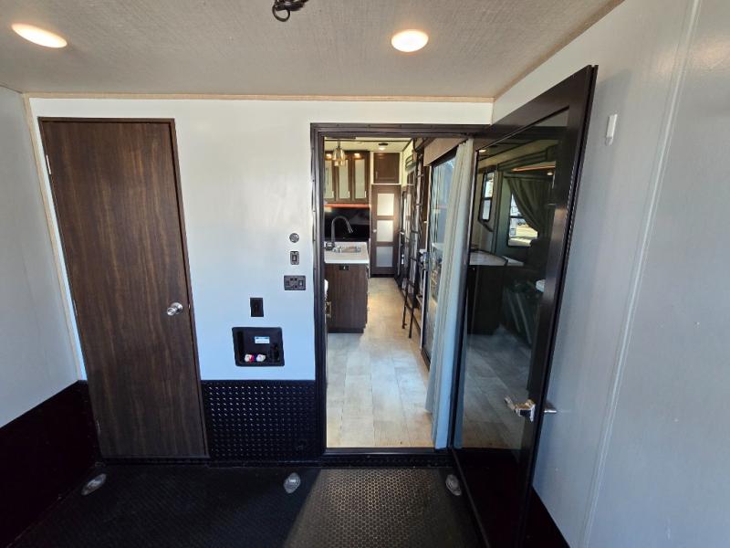 If you are ready to play with your off-road toys, hitch up this Momentum 399TH fifth wheel toy hauler after loading your toys in the 13' garage. You will be able to get cleaned up after getting muddy from the trails in the half bath in the garage or the full bathroom next to the bedroom. The kids can sit on the bar stools at the kitchen island, or relax on the dinette and theater seats while watching the 49" LED TV and fireplace. There are several options to choose from, and many more features to enjoy such as the dual entry doors, fold-down side patio with LED TV, and exteriorunobstructed pass-through storage, plus more!