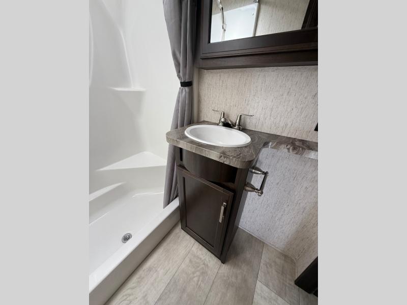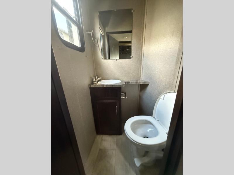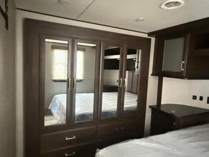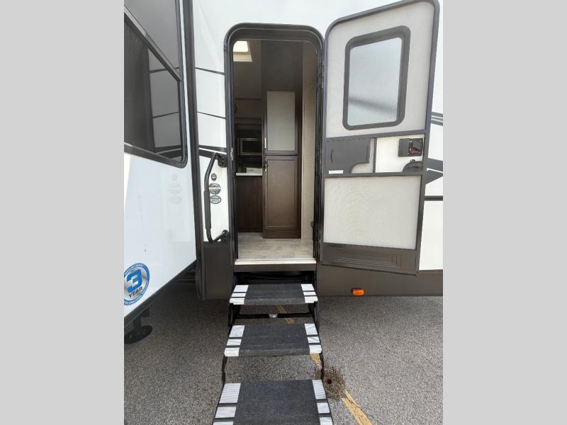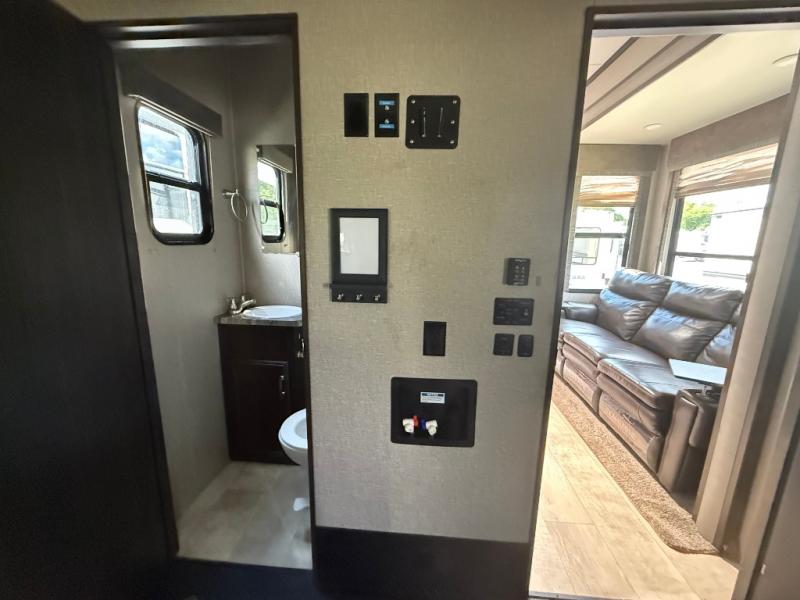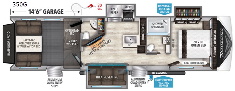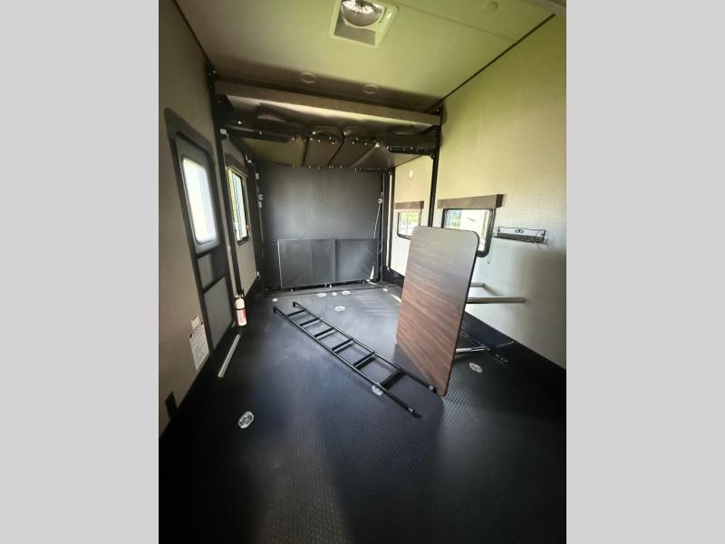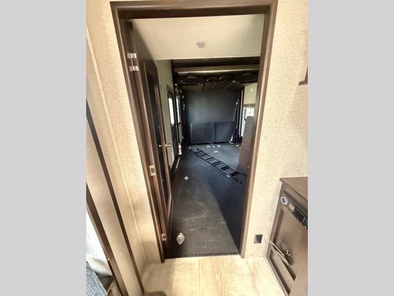 Just imagine the fun you will have with this Momentum G-Class set up at any off-road park. From the 14'6" separate garage that includes a half bath, a side man door as well as seating and sleeping space, plus a loft above, you will have your own area to do what you like. The rear ramp door can even be converted into a patio if you need more outdoor living space. The separate living area offers a fireplace, theatre seating, and kitchen appliances away from the dirty garage floor. You will also be able to stay clean and ready for the next ride with the full bathroom next to the front master retreat with plenty of storage for clothing. You might even choose to add a washer and dryer option to keep everything clean while away from home. Take a look!