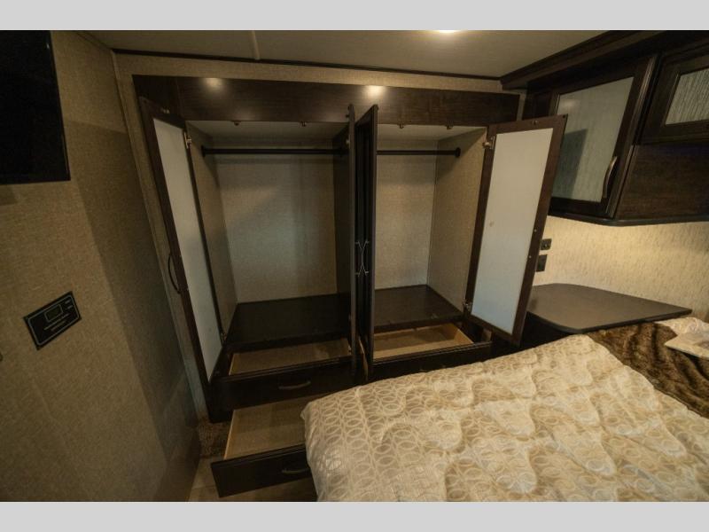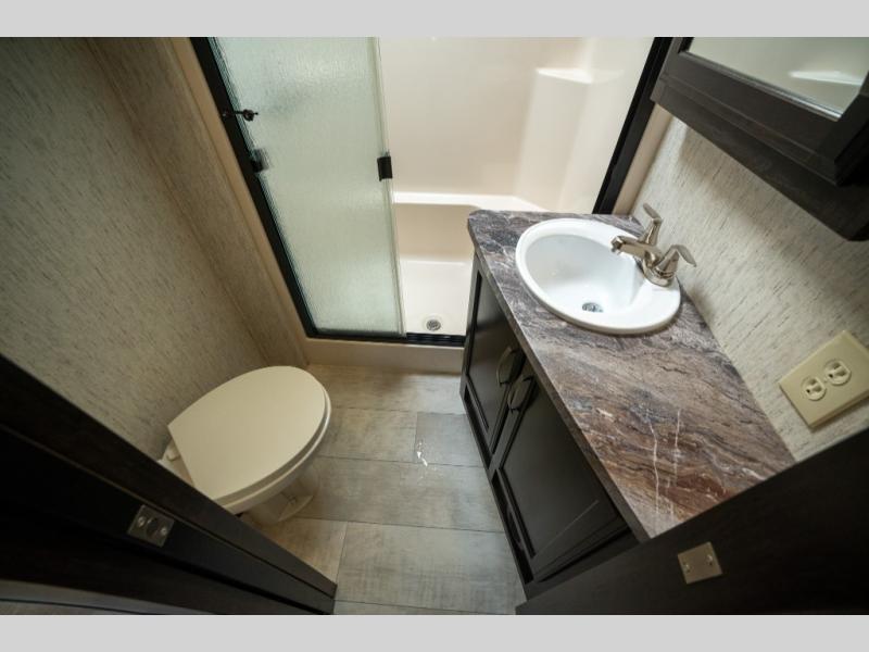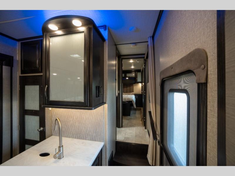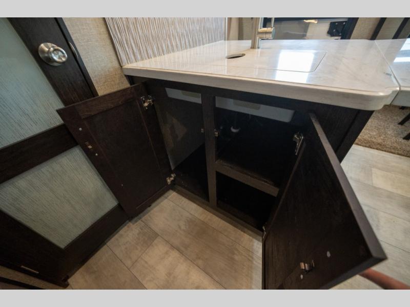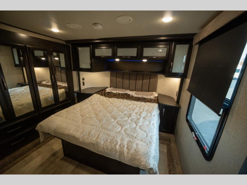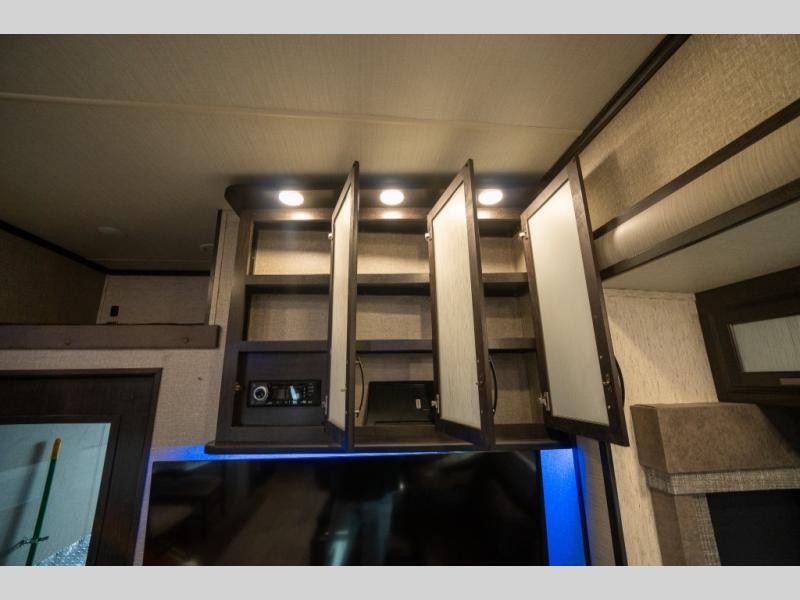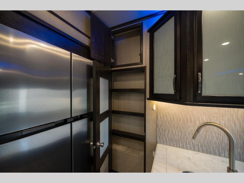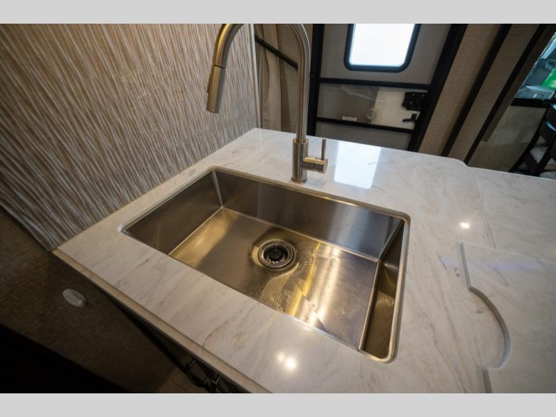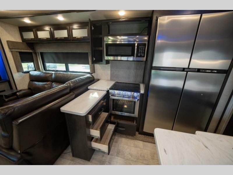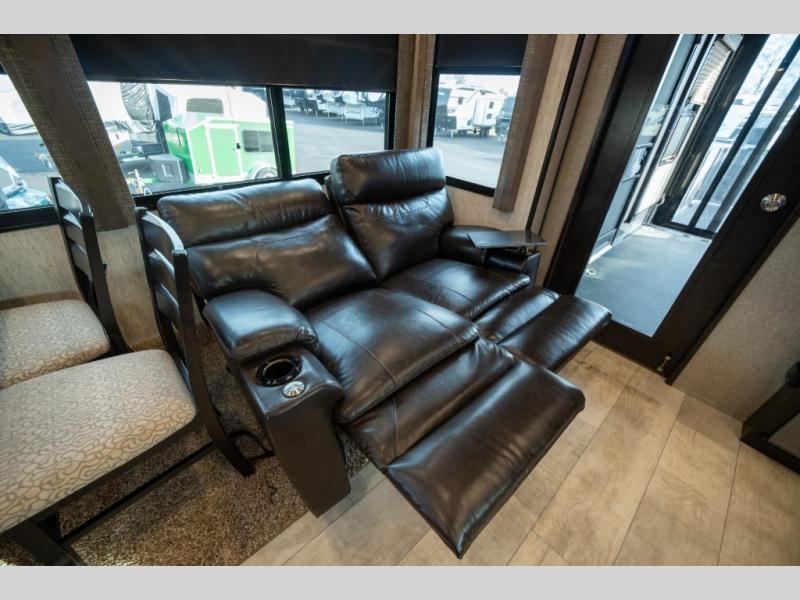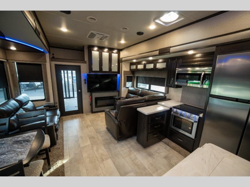 With any Momentum M-Class toy hauler fifth wheel you will enjoy extraordinary living with extreme playtime with the Weather-Tek insulation for four seasons of protection, and a fully enclosed fuel pump station to keep the fun going the whole time. The Tuff-Ply garage flooring is gas and oil resistant, plus triple insulated. You will find 2,500 lb. rated flush-mount tie-downs to keep your toys secure while moving down the road. The interior includes a sofa with headrest and removable swivel table, a convection microwave, a central vacuum system with tools and a dust pan, and a satellite/solar roof access channel to mention a few highlights. Any Grand Design Momentum M-Class allows you to keep your active lifestyle no matter where you decide to stay!