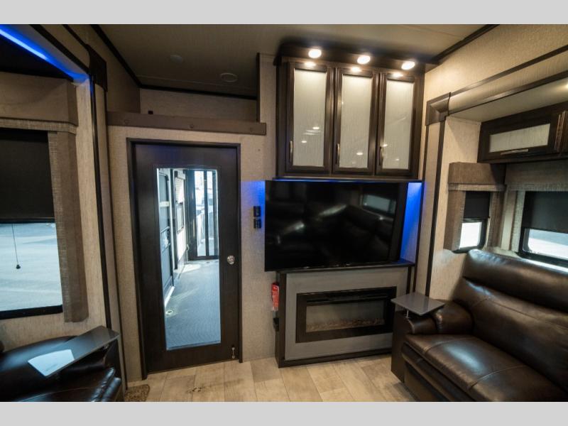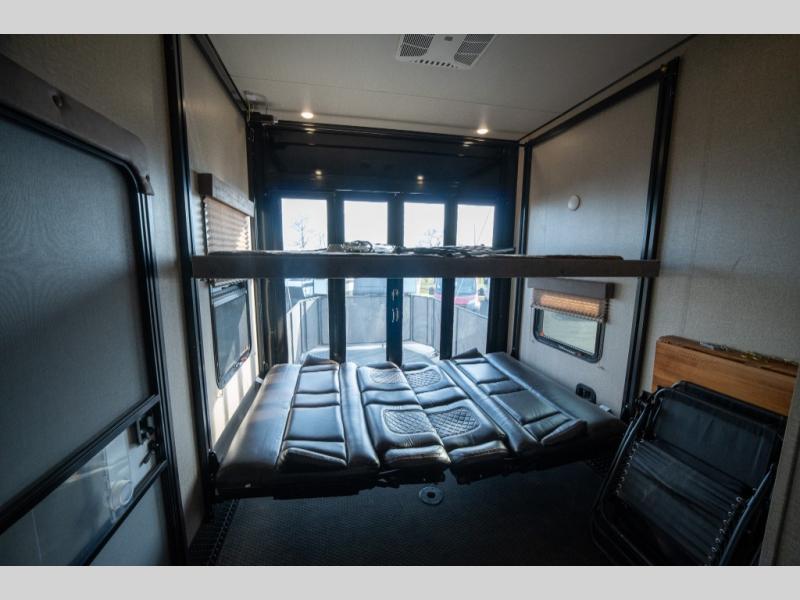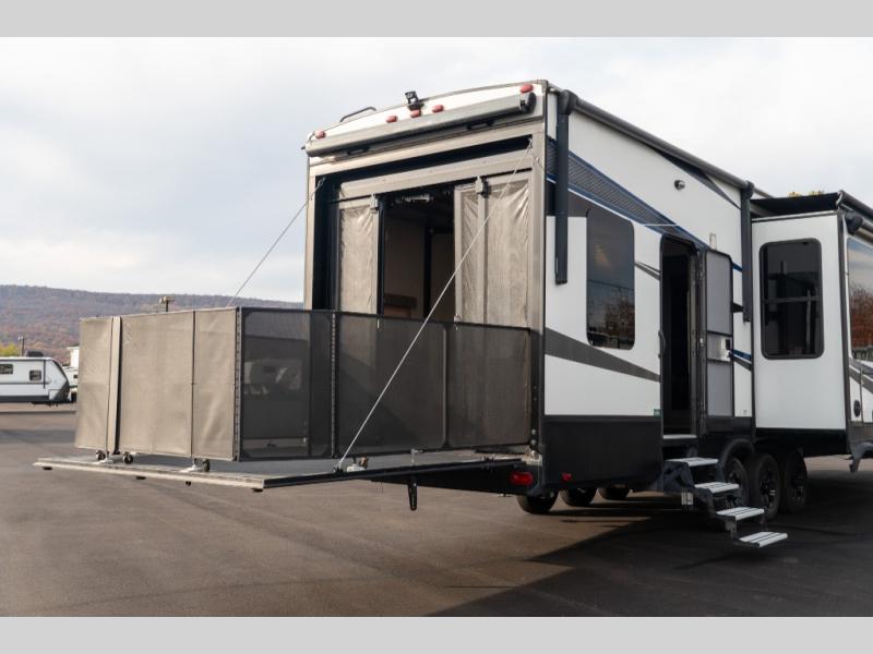 If relaxation and off-road fun have been calling your name, this Momentum M-Class 395M toy hauler fifth wheel will provide the luxury you love along with toy storage. From the garage featuring 12'6" of space for an ATV and dirt bikes and a bath and a half bath to a kitchen and living area with theatre seating, an L-shaped sofa, and a fireplace with a 49" LED TV above, so you can relax indoors when you aren't having fun outdoors.