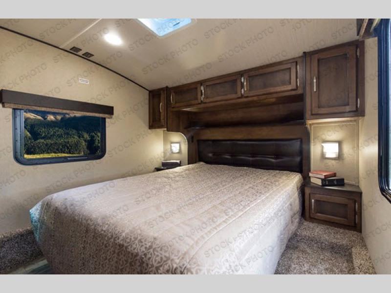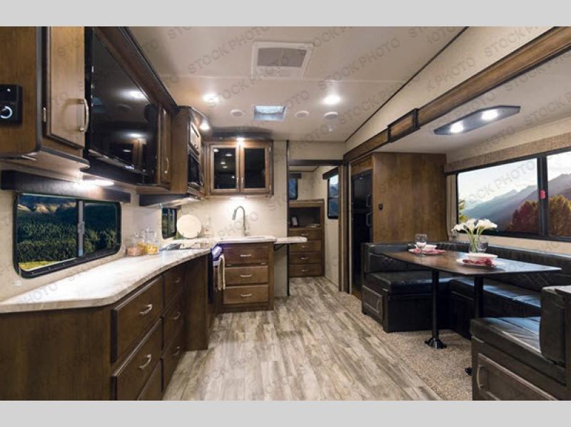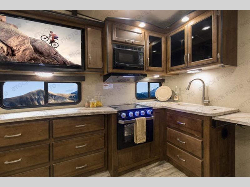With any Reflection 150 Series fifth wheel by Grand Design, you will enjoy the ease of using your short-bed half-ton truck to tow thanks to the 90 degree turning radius swivel pin box. The Universal All-In-One docking station, LP Quick Connect, and One-Touch electric awning with LED light make setting up and packing up easy for those weekenders or full-timers that like to move around to see the countryside. Inside you will find that the bedroom is complete with a king-size wardrobe, a queen bed, and an oversized under-bed storage area. The large panoramic windows on the slide allow you to view the beautiful scenery that you've chosen to camp next to, and the Arctic 4-Seasons Protection package allows you to camp anywhere and anytime of the year.