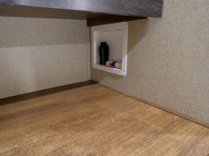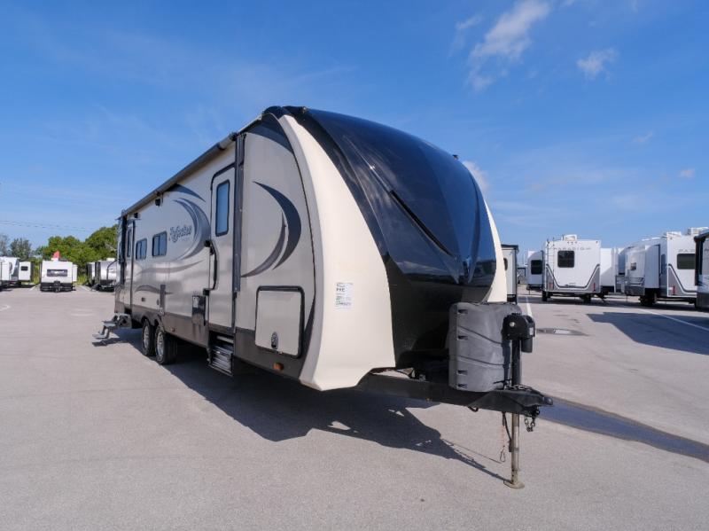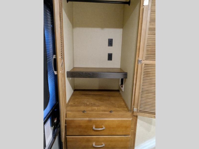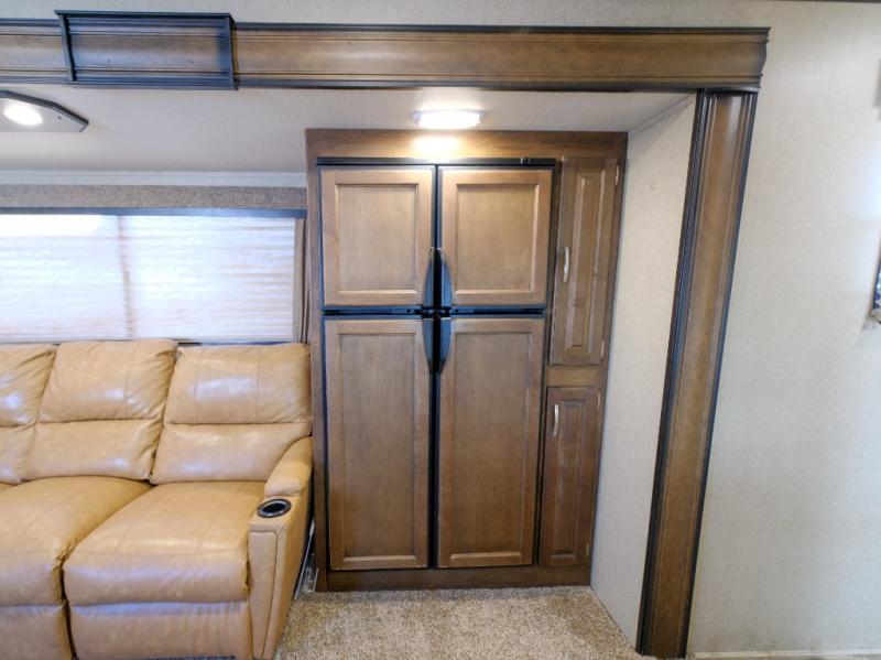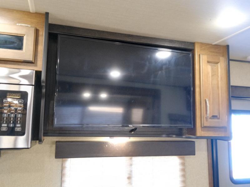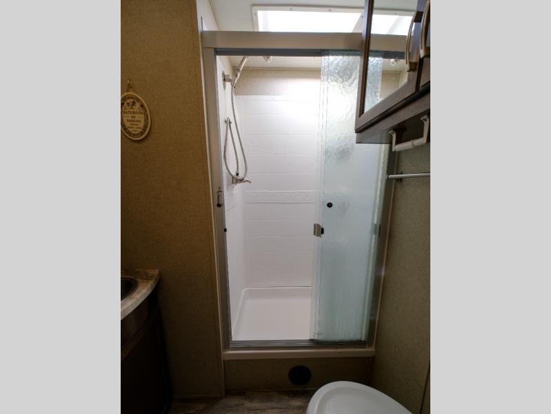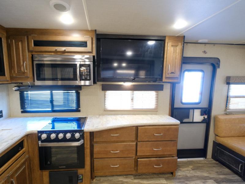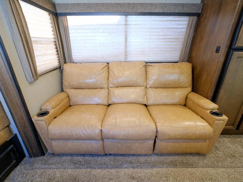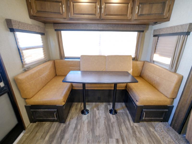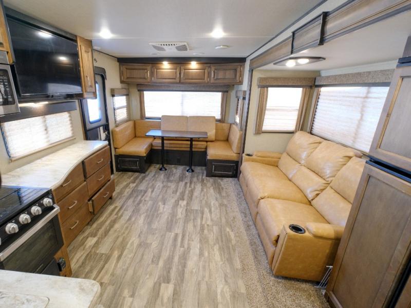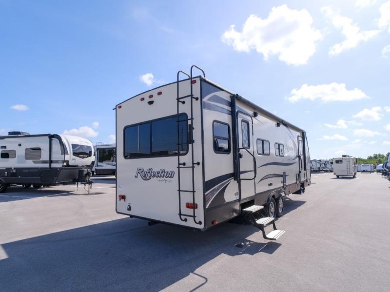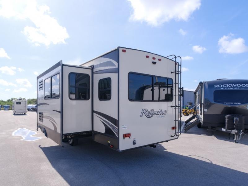You can expect a great camping weekend or week long trip with this Refection travel trailer in tow. This unit is perfect for any couple seeking an outdoor adventure that is also looking to enjoy a bit of at-home comforts as well. Step inside and notice how the outdoors makes its way inside through the large panoramic windows surrounding the rear U-shaped dinette and above the slide out that contains a theatre seat and your 12 cu. ft. refrigerator and pantry. The 78" theatre seat has room for three so you can invite your camp neighbors over and have plenty of seating to enjoy the 40" LED swing arm TV. At night, a queen pillowtop mattress will be a welcome retreat for a great night's rest. You will find plenty of storage for your clothing and things with bedside shirt closets, a king size wardrobe with storage drawers, and more space for the clothing you hang. The underbed storage is also nice for larger items you wish to keep inside. When you wake each morning the full bath nearby will welcome you with a glimpse of the day ahead through the large shower skylight. And, when you are ready for your next adventure, head out through one of the two entry/exit doors.