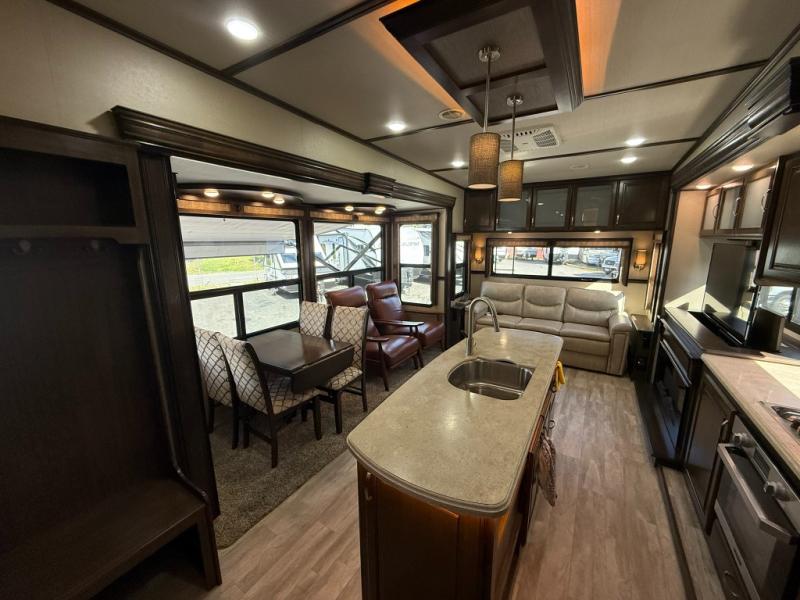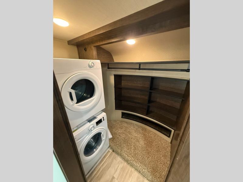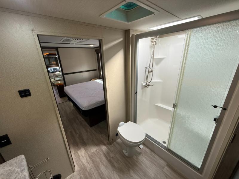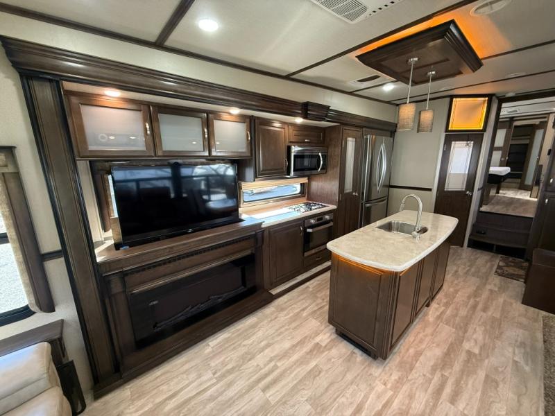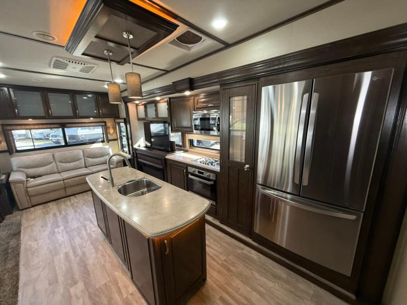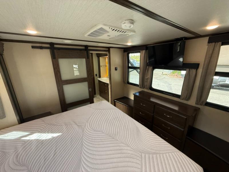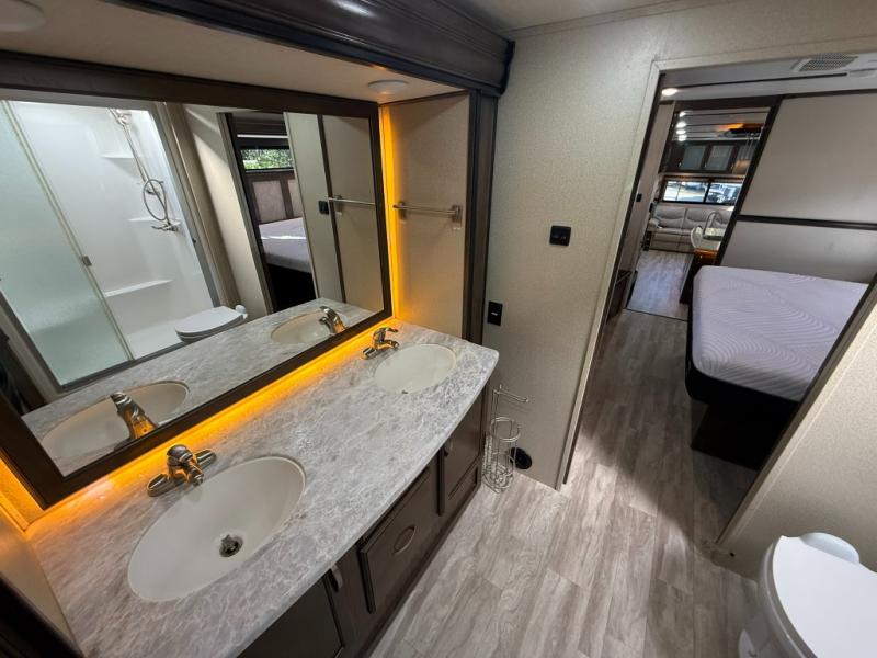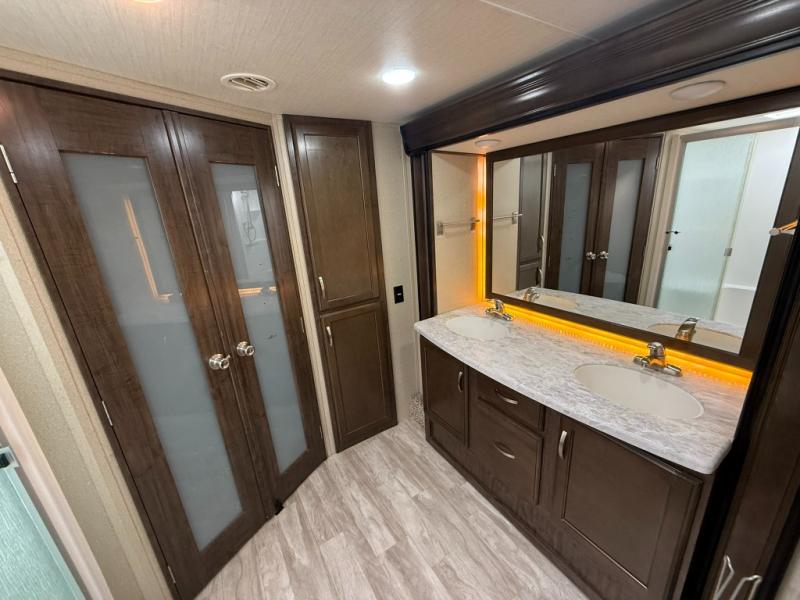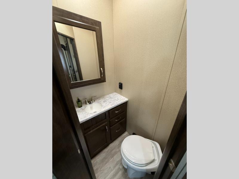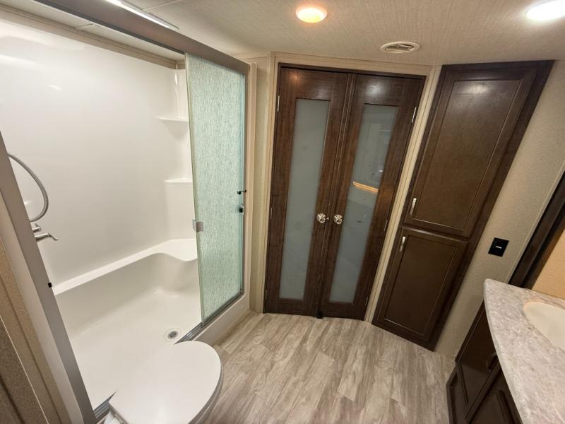 Imagine the convenience of a full master bathroom with dual sinks, and a half bath, plus storage everywhere you look around this fifth wheel. From the two closets next to the entry door, the large walk-in wardrobe in the master bath, the under bed storage, and all the overhead cabinets throughout, you will have plenty of space to invite the grandkids for a week-long stay. Now start thinking about how you will enjoy the walk-through master bedroom with a flip-top dresser, dual benches, and a TV. The cook in the family will surely love making meals in the kitchen including preparing meals on the island. You might even like to choose a few options to make this the perfect full-timer RV!