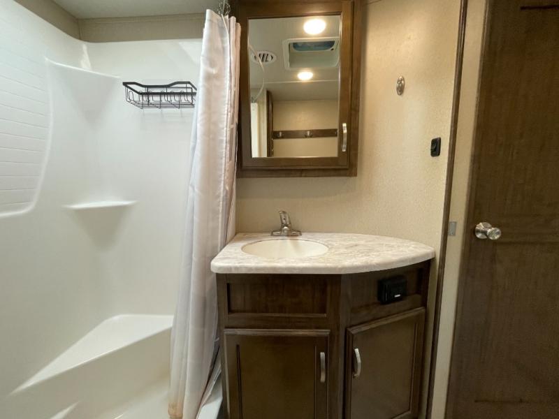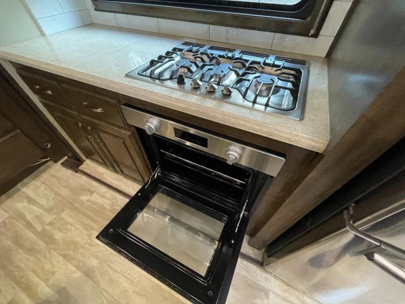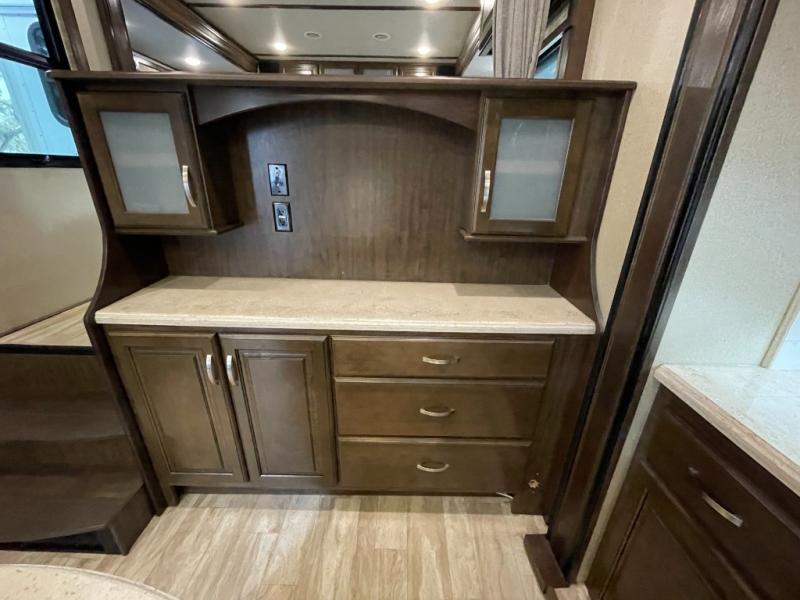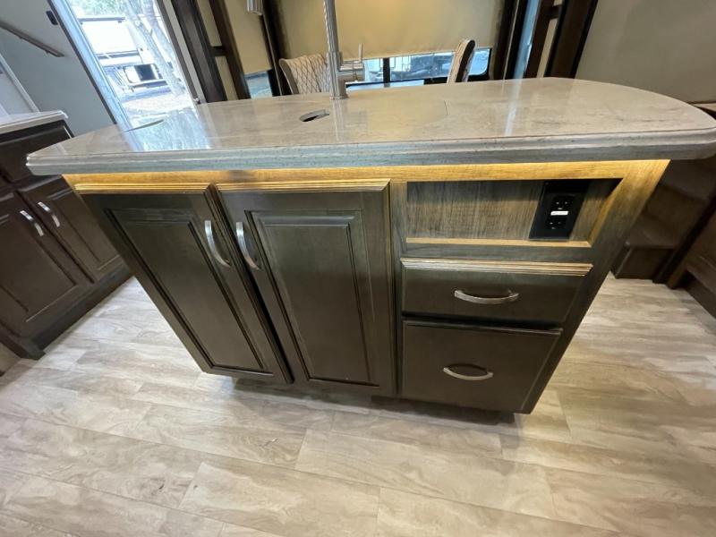 Imagine traveling with comforts of home including plenty of interior floor space to move around, extra sleeping space for the kids or grandkids, and plenty of storage for everything you might need for an extended stay. The unique exterior rear storage includes a sliding tray allowing easy access to the gear in the back. Inside, the front master bedroom will not disappoint with a pullout ottoman, flip-top dresser, and a TV to mention a few features. The chef will surely love making meals with the professional grade stainless steel cooktop, and the buffet adds additional counter space to serve food and/or place your keys and things on. You will find many more features to love, and options to choose from.
