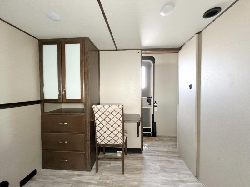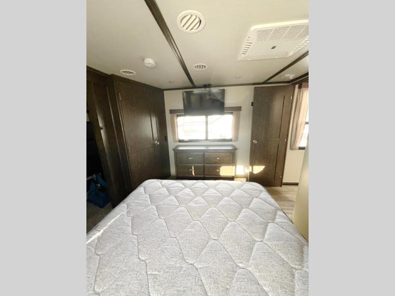 You could be working steps away from the best views of the mountains! Imagine a bunkhouse including a sofa and a desk for your multi-purpose room. You will find a loft above for extra sleeping space or storage, a full bathroom and a master bedroom with everything you need! The kitchen includes a professional grade stainless steel cooktop, built-in oven, convection microwave, and a stainless steel 18 cu. ft. four door refrigerator, plus a large pantry. You will also love the center island and hutch for additional space for your things. You will certainly enjoy the fireplace, theatre seating, and any option you choose to make your life better on the open road!