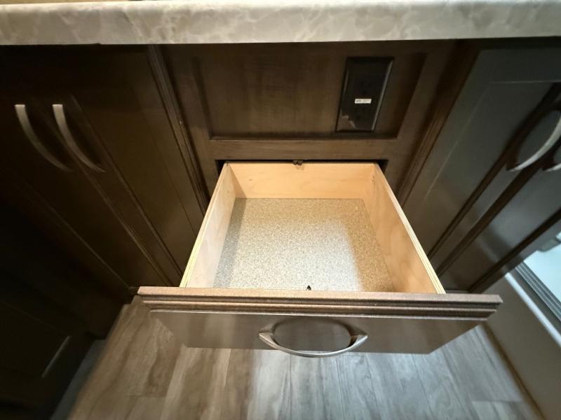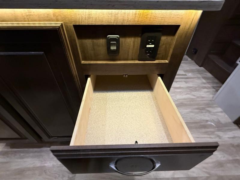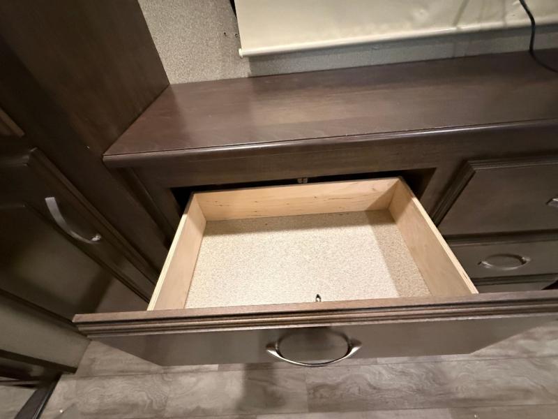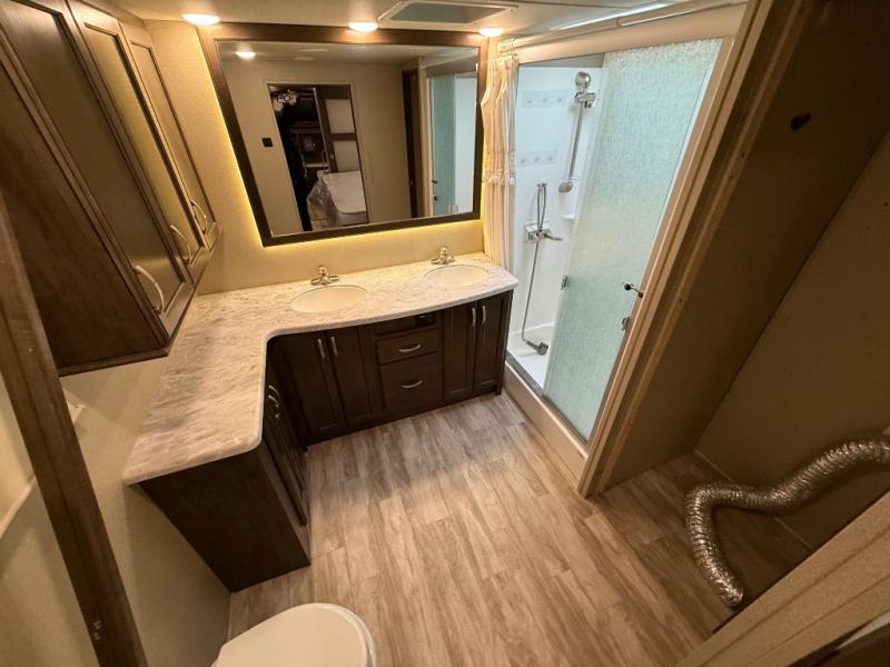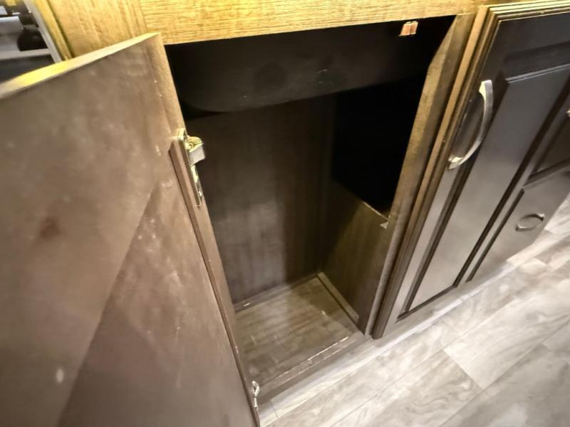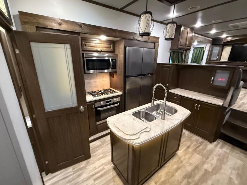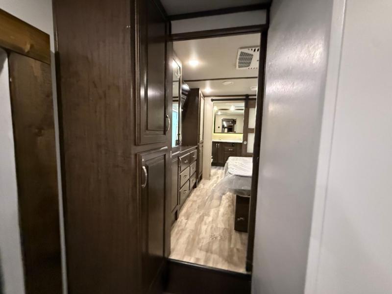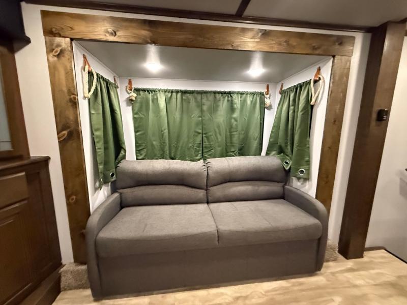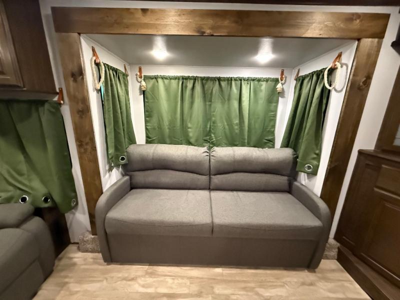 If you have been wanting to make the move to full-time RVing, imagine enough walking around space with five slide outs, extra sleeping accommodations for the grandkids in the front separate living area, and plenty of storage for all your things. You will find a dream kitchen for the cook in the family, plus the free standing dinette offers a cozy place to eat meals. The walk-through bedroom features two space savings sliding doors, and the rear master bathroom offers dual sinks, one for you and one for your spouse. You might even decide to add a few options such as a washer and dryer and/or a king size bed. Outside, there is a pass-through compartment, and rear storage with a sliding tray making getting to your gear easy. Take a look, you will be happy you did!
