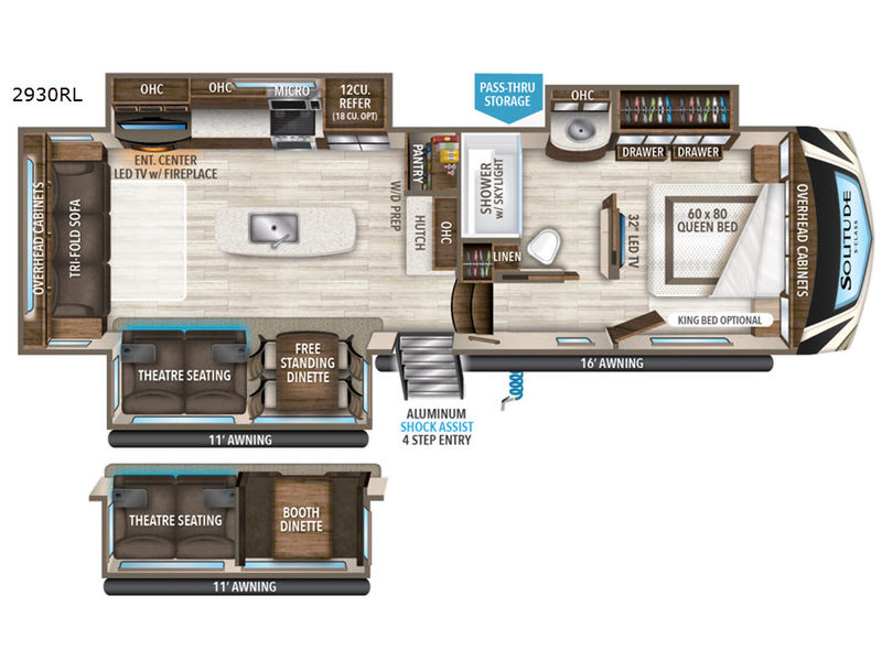 With each Solitude S-Class fifth wheel by Grand Design you will receive affordable luxury for your extended stays or weekend get-a-ways. From the solid foundation including Equa-Flex suspension to the taller ceilings, taller and deeper cabinets, the power reclining theatre seating with swivel tables including LED lighting, plus a heat and massage function, a Stealth AC system, and the Weather-Tek package which allows you to travel any season you choose. It's time to enjoy luxury living where ever you decide to land.