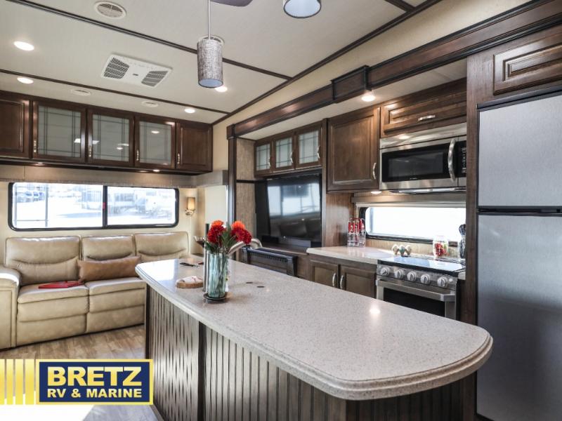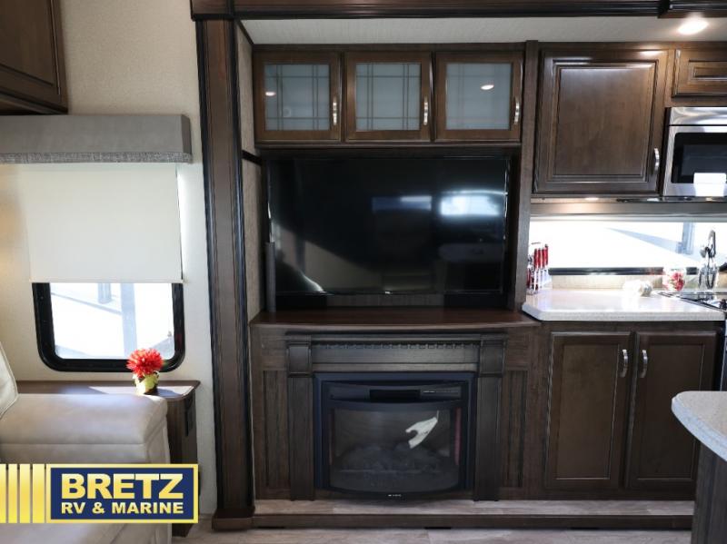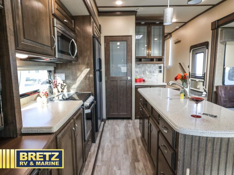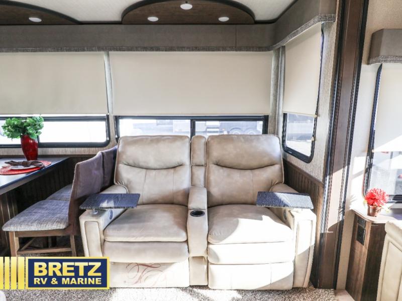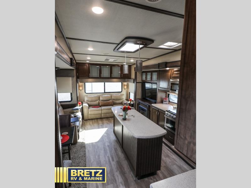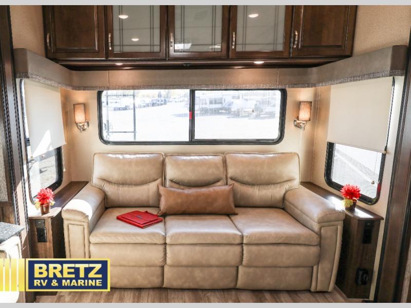 You'll feel right at home in this spacious fifth wheel with triple slides, a front master bedroom, and a kitchen island with extra counter space. The theatre seating is right across from the LED TV and fireplace, and there is a rear tri-fold sofa if you have any guests stay over. This model includes a hutch in the kitchen with cabinets above to store you nice dishes, plus there is a large pantry with washer and dryer prep if you plan to go full-time. Head to the dual entry bath that includes a linen closet and a spacious shower with a skylight, and check out the front master bedroom with its queen bed, slide out wardrobe, and 32" LED TV!