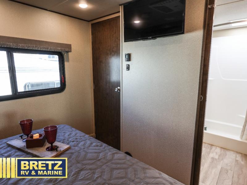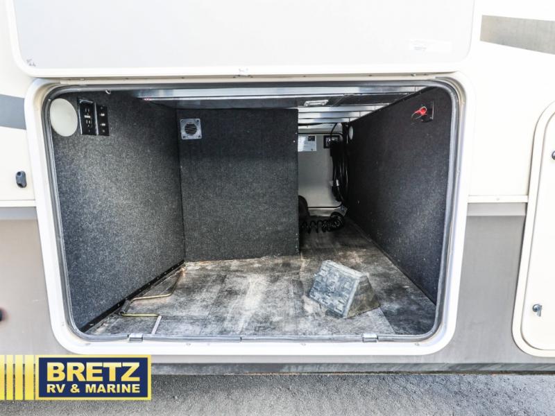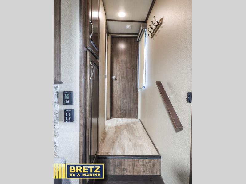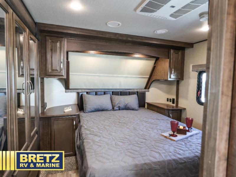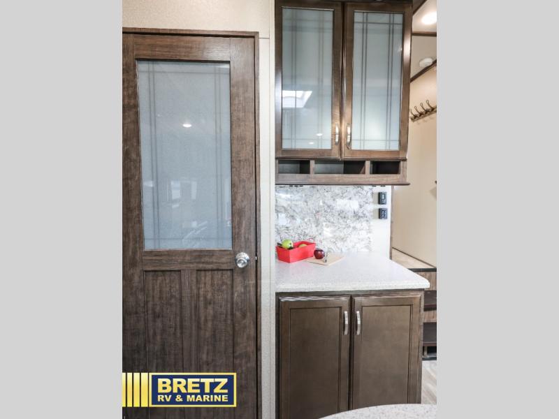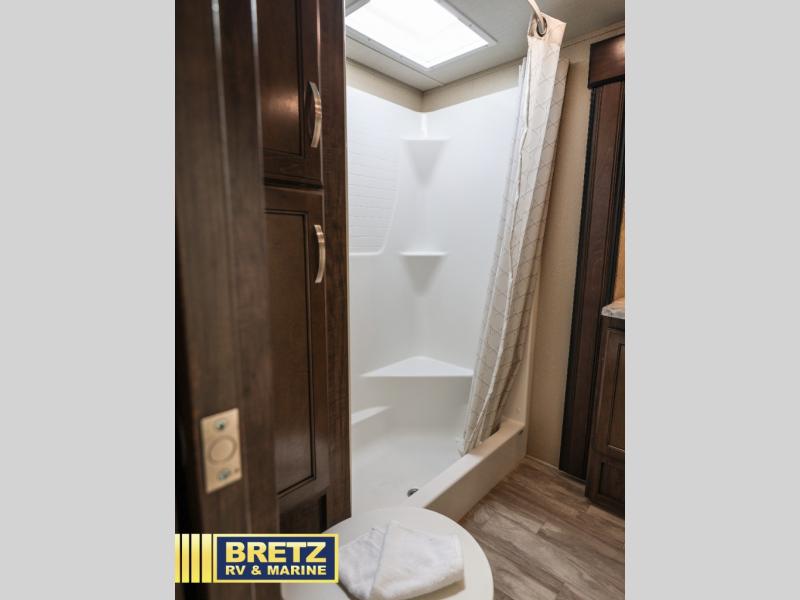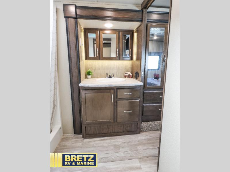 You'll feel right at home in this spacious fifth wheel with triple slides, a front master bedroom, and a kitchen island with extra counter space. The theatre seating is right across from the LED TV and fireplace, and there is a rear tri-fold sofa if you have any guests stay over. This model includes a hutch in the kitchen with cabinets above to store you nice dishes, plus there is a large pantry with washer and dryer prep if you plan to go full-time. Head to the dual entry bath that includes a linen closet and a spacious shower with a skylight, and check out the front master bedroom with its queen bed, slide out wardrobe, and 32" LED TV!