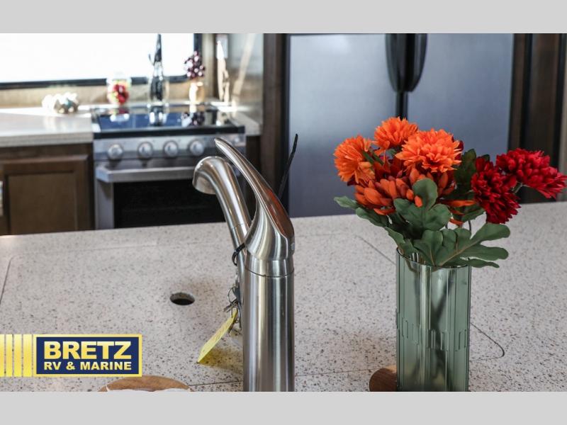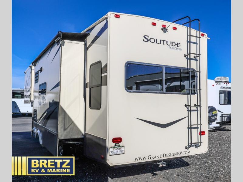 With any Solitude S-Class fifth wheel by Grand Design you will appreciate the Max Built Construction Package that features a 101" wide-body, gel coat exterior sidewalls, heavy-duty 7,000 lb. axles, plus many more durable construction materials. The self-adjusting brakes and the MORryde CRE3000 suspension system will provide a smooth towing experience, and each model includes heavy duty 17.5" H-rated tires with NitroFill. Some of the features you are sure to love are included in the Residential Living Package, like the solid surface countertops and sink covers, the hardwood cabinet doors, the night stands with USB ports, and the Rockford Fosgate stereo entertainment system with HDMI and App controls. These fifth wheels are extended-stay approved thanks to the Weather-Tek Package with a 35,000 BTU high-capacity furnace, the Stealth A/C system, and many high-end residential finishes to make you feel like you taken home with you!