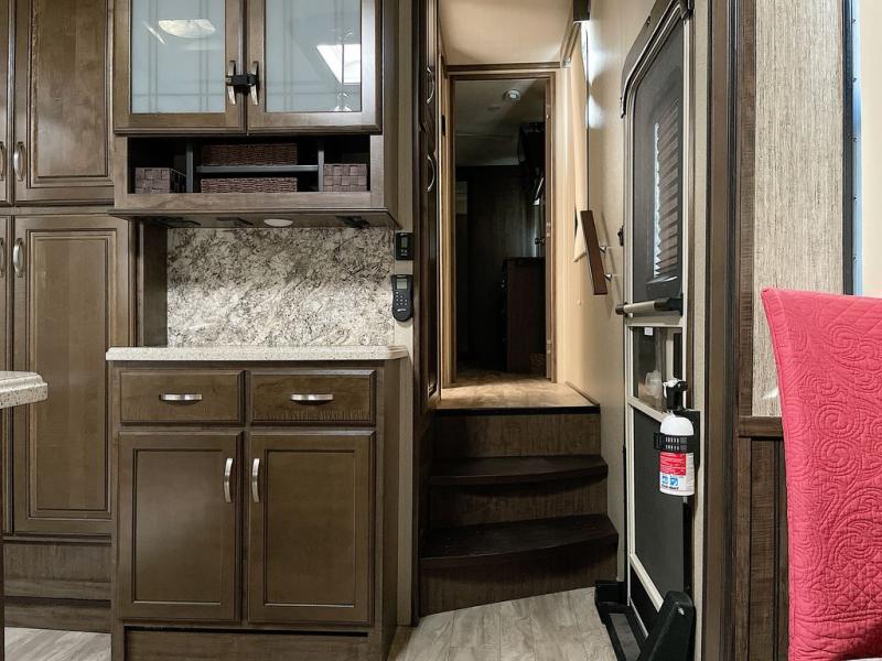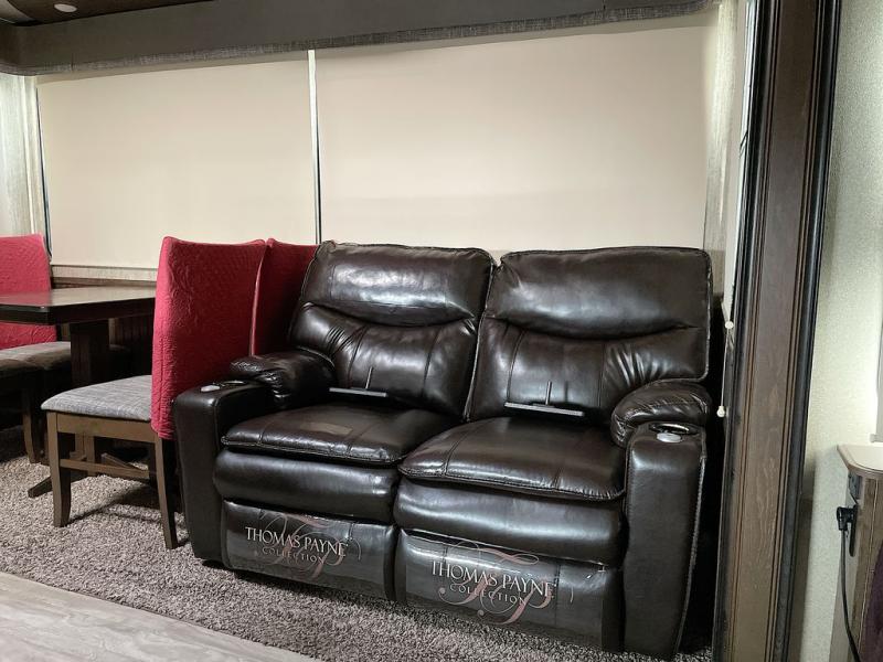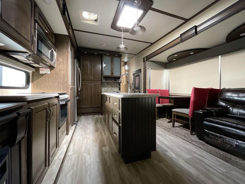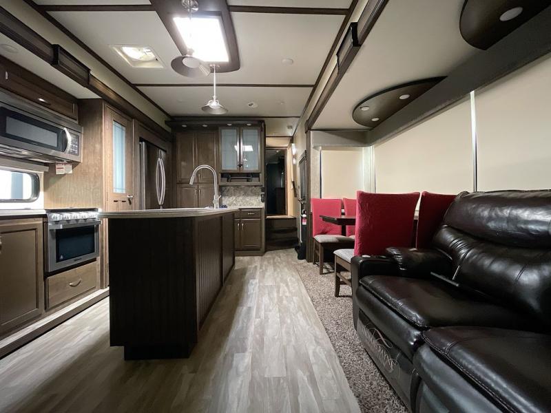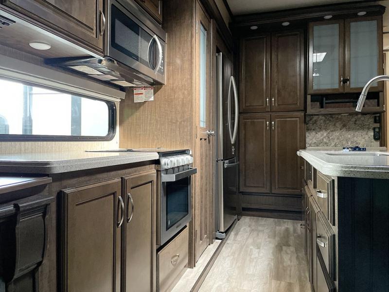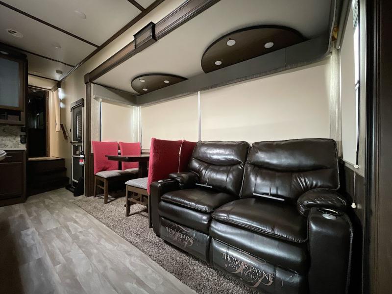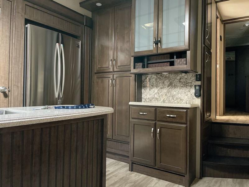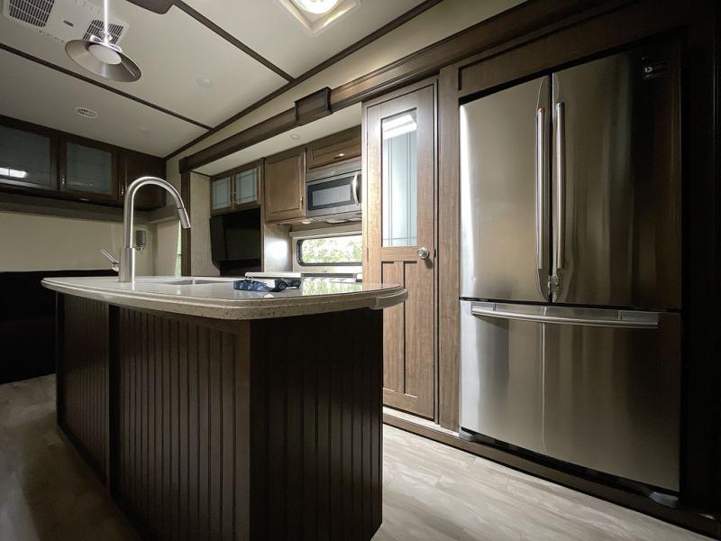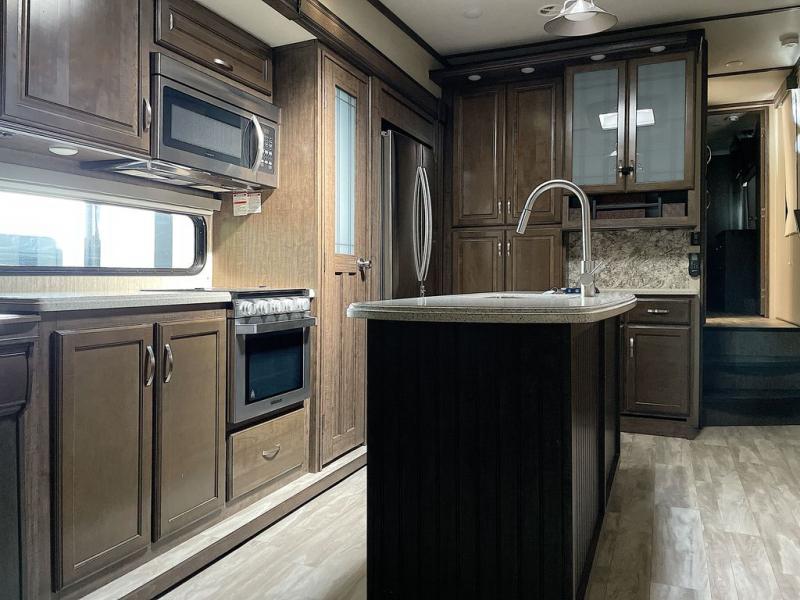 This Solitude S-Class fifth wheel will have you daydreaming about all the places you will visit, and maybe change you into a full-timer once you see all the amenities. Of course your sleeping accommodations are very important to you, the front master suite offers a queen bed or choose an optional king size if you prefer. And your spouse will surely love having her own sink in the bathroom, and plenty of clothing storage in the bedroom. The cook will enjoy using the professional grade stainless steel cooktop and convection microwave, the oversized pantry, the hutch, the stainless steel 12 cu. ft.four door refrigerator, plus the kitchen island. Everyone can relax in the rear living area on the tri-fold sofa or on the theatre seats for a massage. There are many more features to enjoy such as the fireplace, and options to add like a washer and dryer and/or a residential refrigerator. Start your plans now!