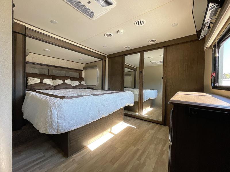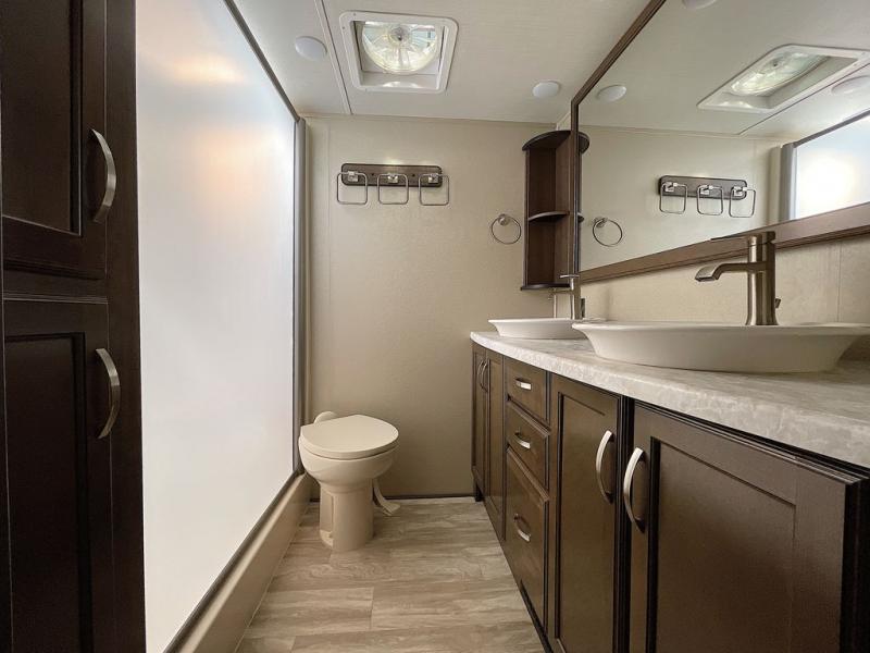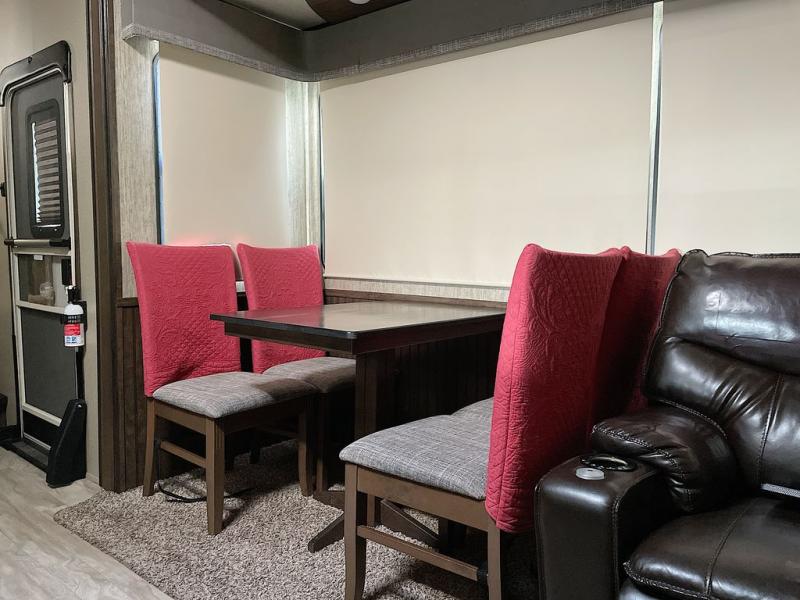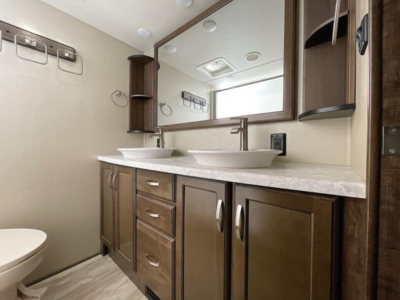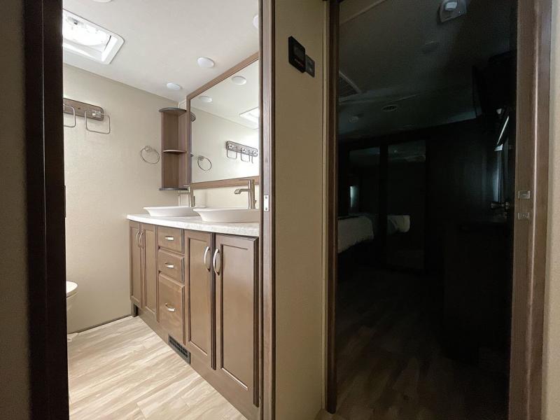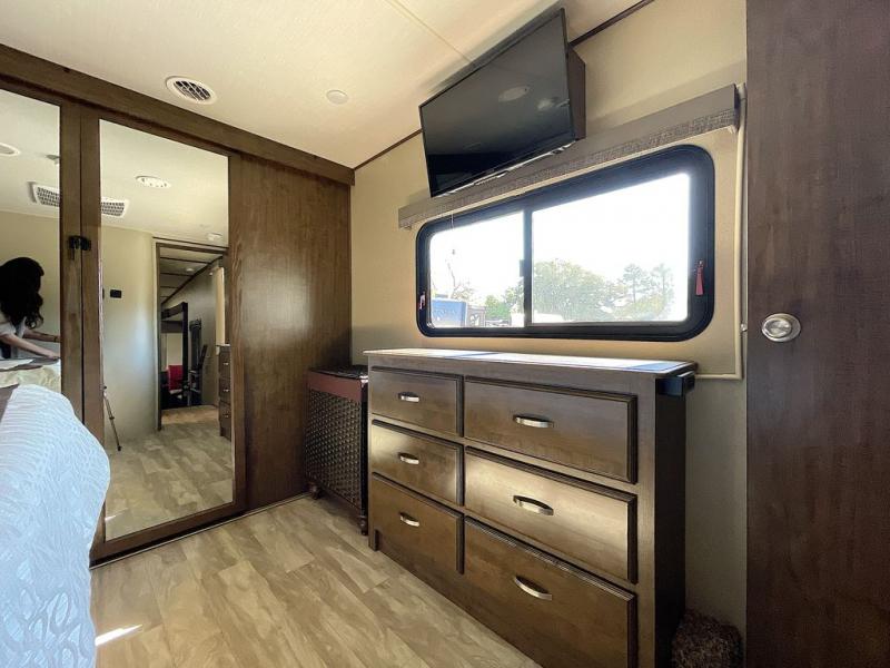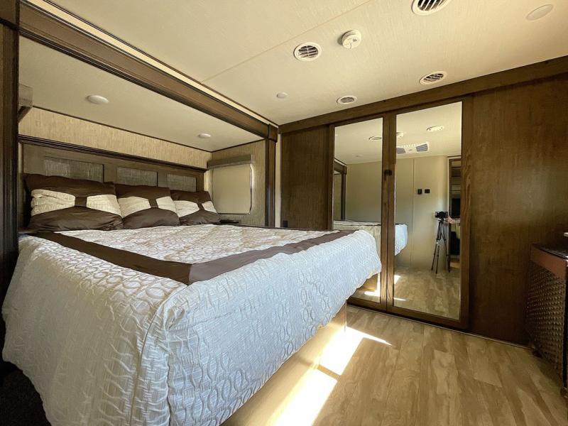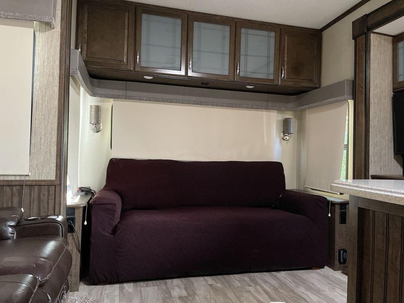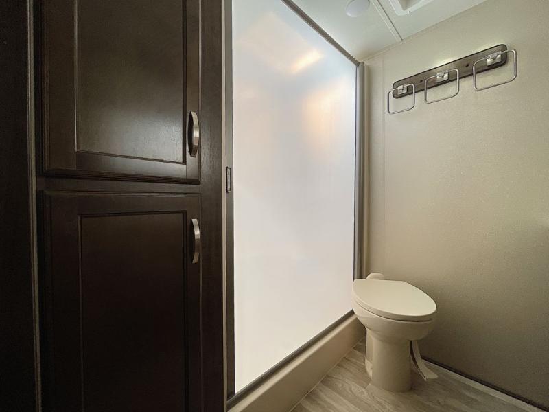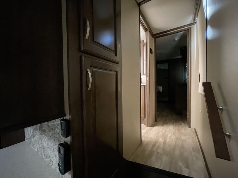 This Solitude S-Class fifth wheel will have you daydreaming about all the places you will visit, and maybe change you into a full-timer once you see all the amenities. Of course your sleeping accommodations are very important to you, the front master suite offers a queen bed or choose an optional king size if you prefer. And your spouse will surely love having her own sink in the bathroom, and plenty of clothing storage in the bedroom. The cook will enjoy using the professional grade stainless steel cooktop and convection microwave, the oversized pantry, the hutch, the stainless steel 12 cu. ft.four door refrigerator, plus the kitchen island. Everyone can relax in the rear living area on the tri-fold sofa or on the theatre seats for a massage. There are many more features to enjoy such as the fireplace, and options to add like a washer and dryer and/or a residential refrigerator. Start your plans now!