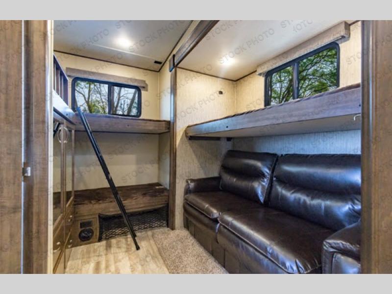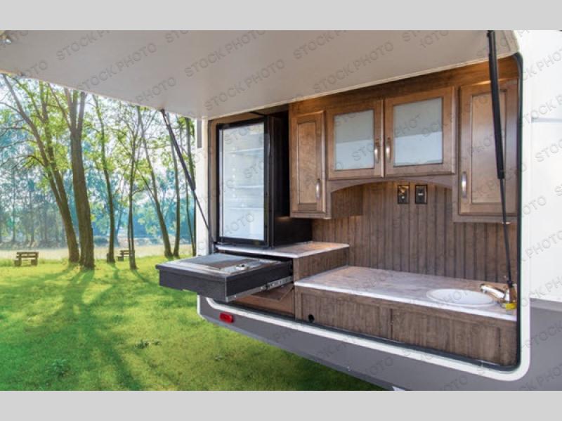 If you are a full-timer or a weekend warrior that enjoys taking the family with you to see the countryside, this fifth wheel might be perfect for you. The owners can relax in the front master suite while the kids call the rear bunkhouse with a half bath and second exterior entry door their own private oasis away from mom and dad. Everyone will enjoy coming together for meals in the spacious kitchen and living area thanks to the dual slide outs. The cook can make meals with the professional grade stainless steel cooktop and convection microwave, plus store dry goods and snacks in the the oversized pantry and stainless steel 12 cu. ft. four door refrigerator. The cook might even like to grill burgers outside on the outdoor kitchen. Be sure to keep warm by the fireplace while watching your favorite team on the big screen TV. You might even like to choose a few options such as adding a washer and dryer, a king size bed, a residential refrigerator, and/or a super sofa. Come see what else you can't camp without in this Solitude S-Class.