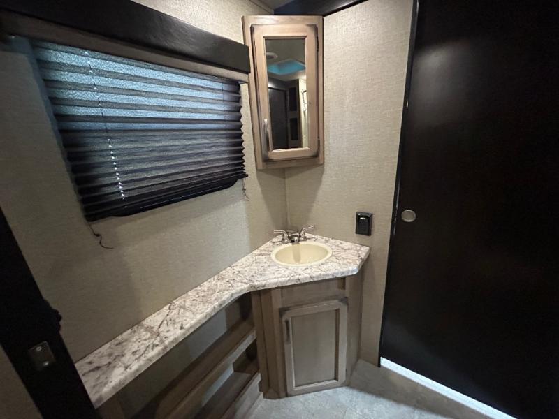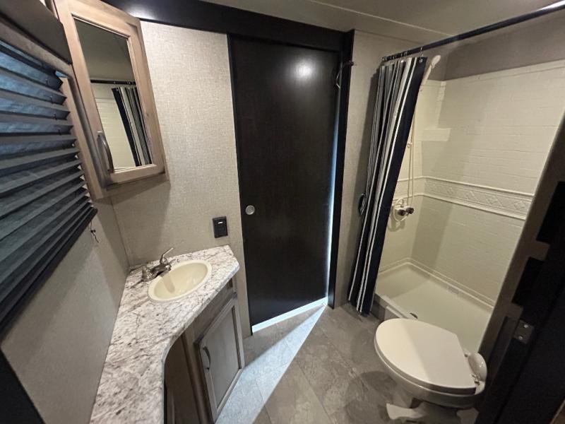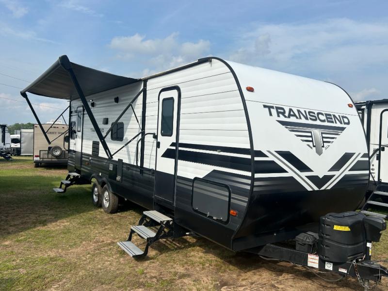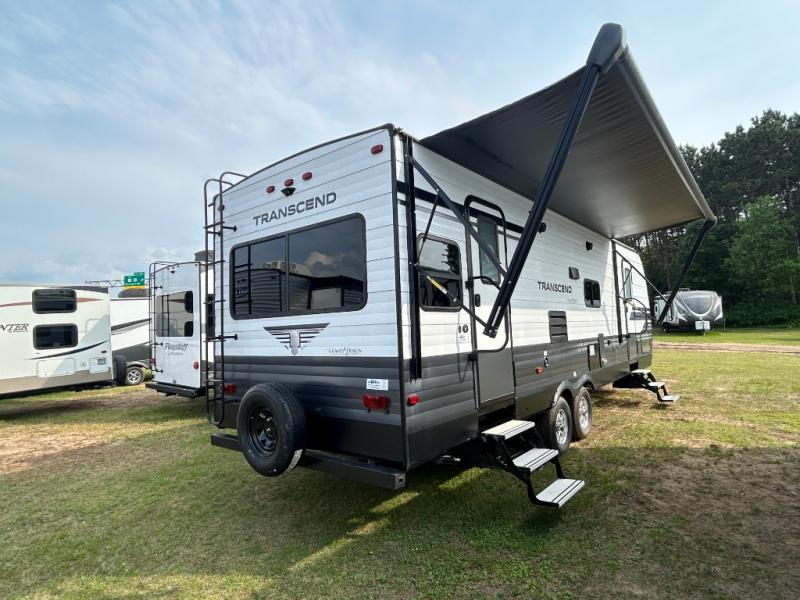 A spacious interior in this Transcend travel trailer will keep you enjoying life on the road thanks to the large slide that opens up the living area. You will enjoy theater seating and a booth dinette within the slide, plus a tri-fold sofa along the rear wall for more seating and added sleeping space for overnight family and friends. Two entry doors make it convenient for moving in and out with a private entry into the front master bedroom where you will enjoy a great night's sleep on a queen-size bed. This unit features a walk-through bath that includes a walk-in shower. The walk-through bath provides a much larger footprint, and the sliding doors create the feeling of even more space when moving into the bedroom. You will also appreciate the 19' electric awning which allows you to have an outdoor living space to enjoy as well!