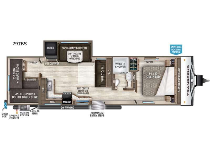 Sleeping space for ten is easy to manage with this Transcend travel trailer which includes a double and two single bunks, a tri-fold sofa, a queen bed, and an 80" U-shaped dinette. Cooking will also be a breeze for your entire crew with the added outdoor kitchen. You can easily whip up large meals with a two-burner cooktop outside and a three-burner range with oven and overhead microwave indoors. The private front bedroom and rear private bunkhouse allow for quiet spaces to relax and unwind for both adults and children. A convenient full bath near the entry door is just what you need to accommodate all guests, and the rear bumper spray port makes it easy to spray off dirty and sandy feet after a full day of outdoor fun. You will also find the pet drawer beneath the refrigerator handy for keeping the family pet easily fed.