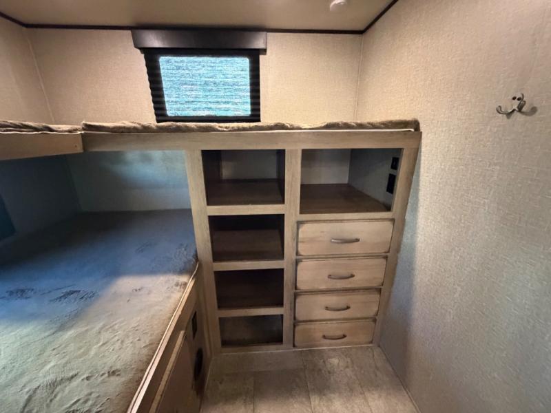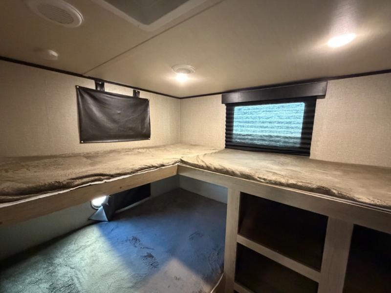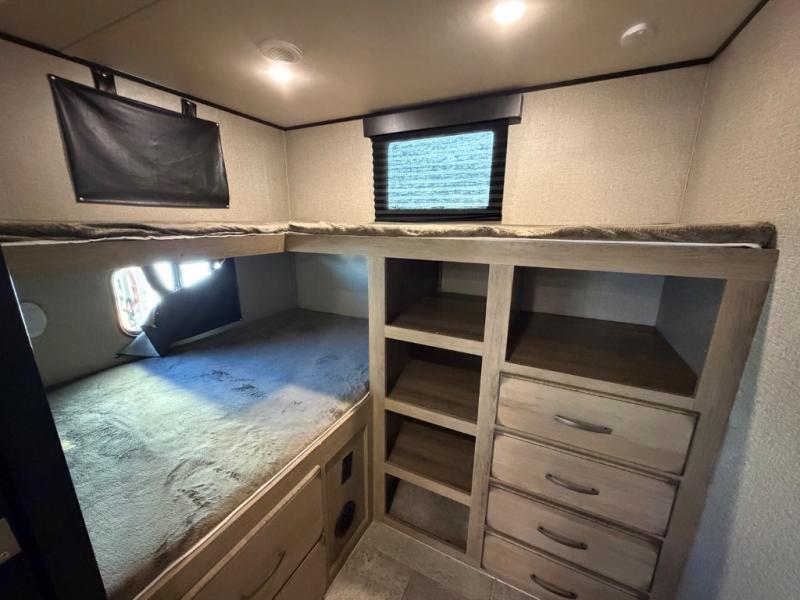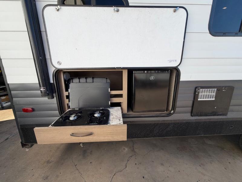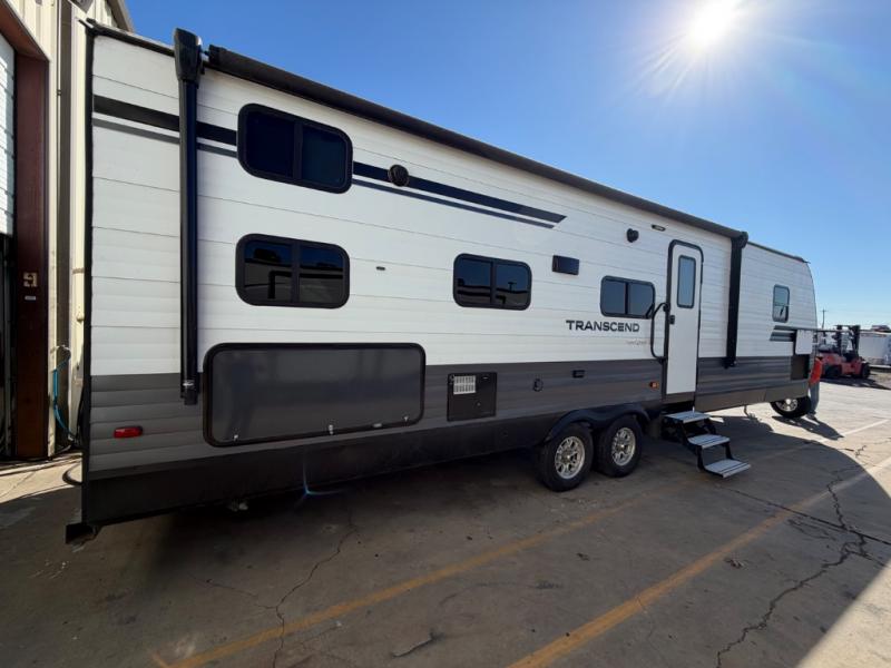 Sleeping space for ten is easy to manage with this Transcend travel trailer which includes a double and two single bunks, a tri-fold sofa, a queen bed, and an 80" U-shaped dinette. Cooking will also be a breeze for your entire crew with the added outdoor kitchen. You can easily whip up large meals with a two-burner cooktop outside and a three-burner range with oven and overhead microwave indoors. The private front bedroom and rear private bunkhouse allow for quiet spaces to relax and unwind for both adults and children. A convenient full bath near the entry door is just what you need to accommodate all guests, and the rear bumper spray port makes it easy to spray off dirty and sandy feet after a full day of outdoor fun. You will also find the pet drawer beneath the refrigerator handy for keeping the family pet easily fed.