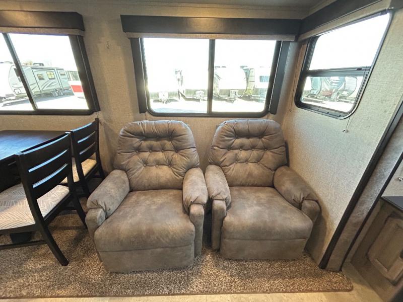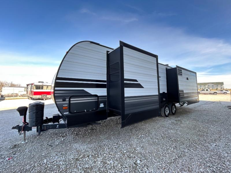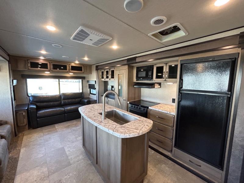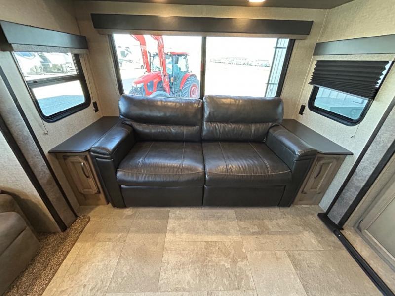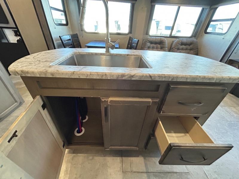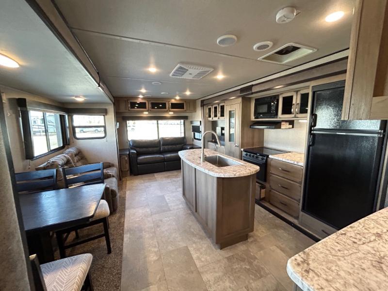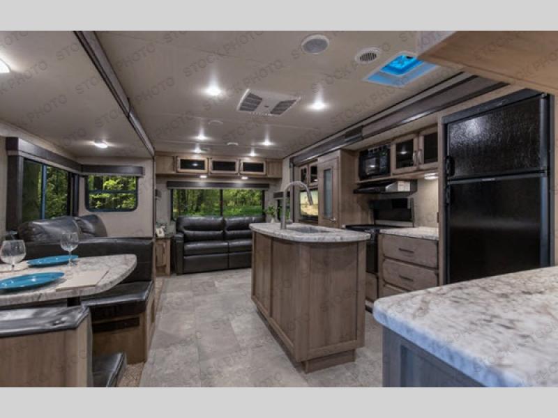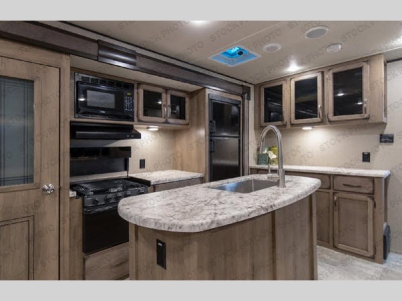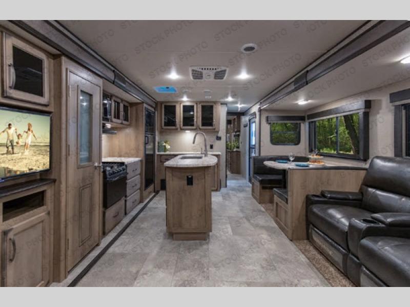 Have you been thinking about getting an RV but haven't decided which type? Do you want to have all the conveniences of home and enough space to move around? This Transcend travel trailer offers just that with its three slides, a kitchen island, and a large private bedroom so that space is no issue. The rear living area includes a tri-fold sofa and theatre seats, plus a 40" LED HDTV. The cook will love the kitchen island for preparing and serving food, as well as washing dishes, and don't forget that there are two electric awnings that provide an outdoor living area protected from the elements.