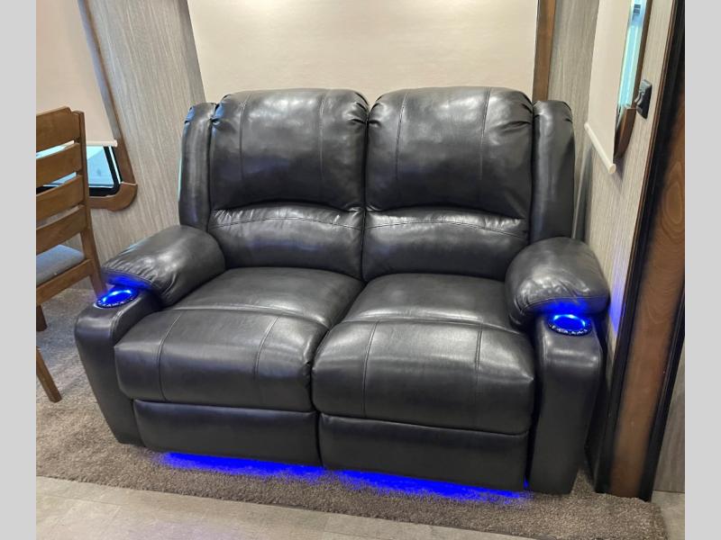 Your whole family will find plenty of room to spread out and enjoy their time in this quad slide out Big Country 3850 MB fifth wheel. The rear living area features plenty of seating space with a sofa and optional theater seats. Just off of the kitchen there is a den with a sofa and a spot for a TV. Above you will find a loft that you kids are sure to enjoy! You can enter the private front bedroom from either the hallway or from the bathroom. In the bedroom there is a slide out with a king bed plus plenty of storage and the corner wardrobe has even been prepped for a washer and dryer!